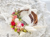 可愛らしいプリザーブドローズ2輪とドライフラワーユーカリ等使用してフレッシュで可愛い爽やかなリースをデザインしました。