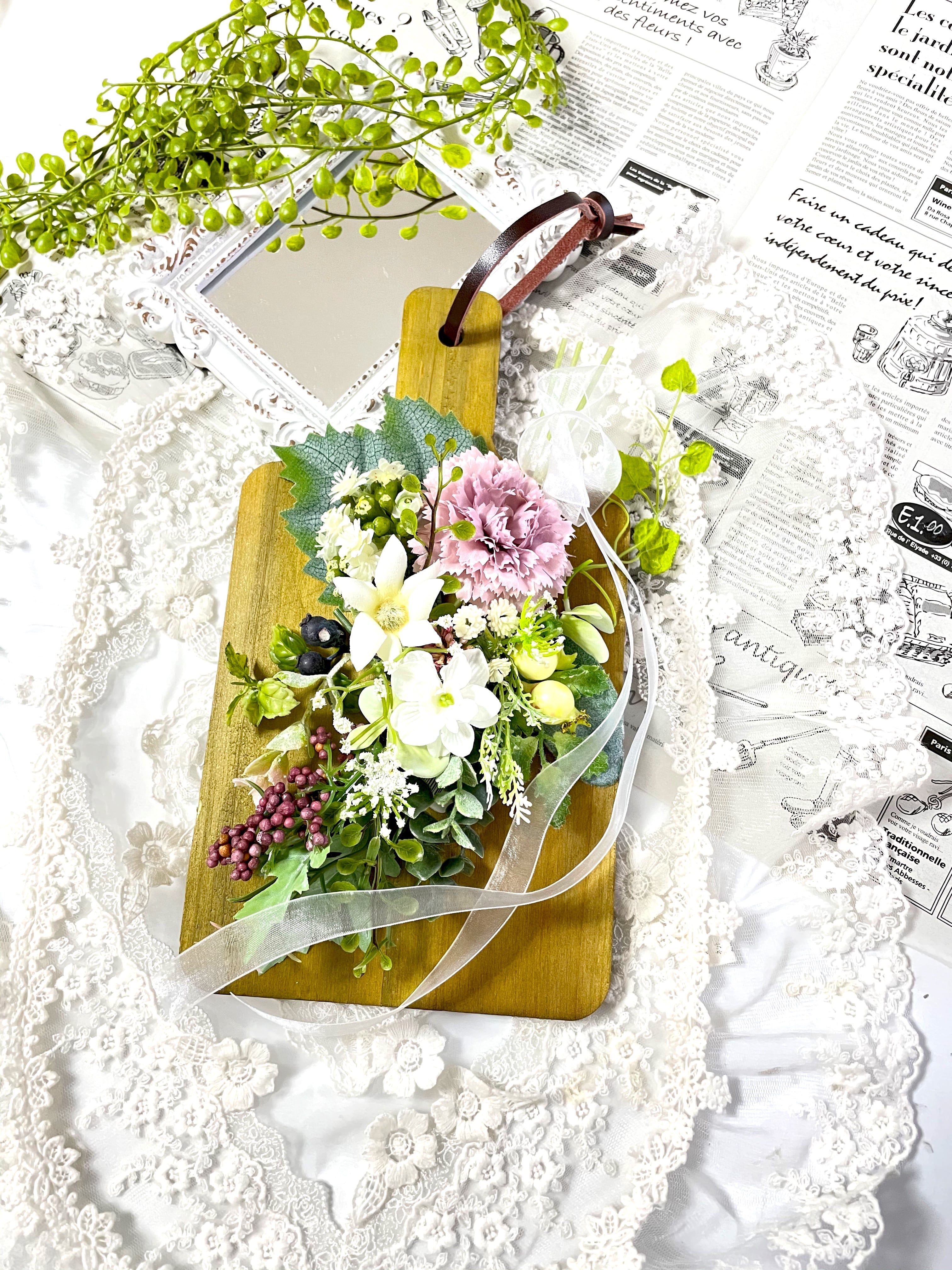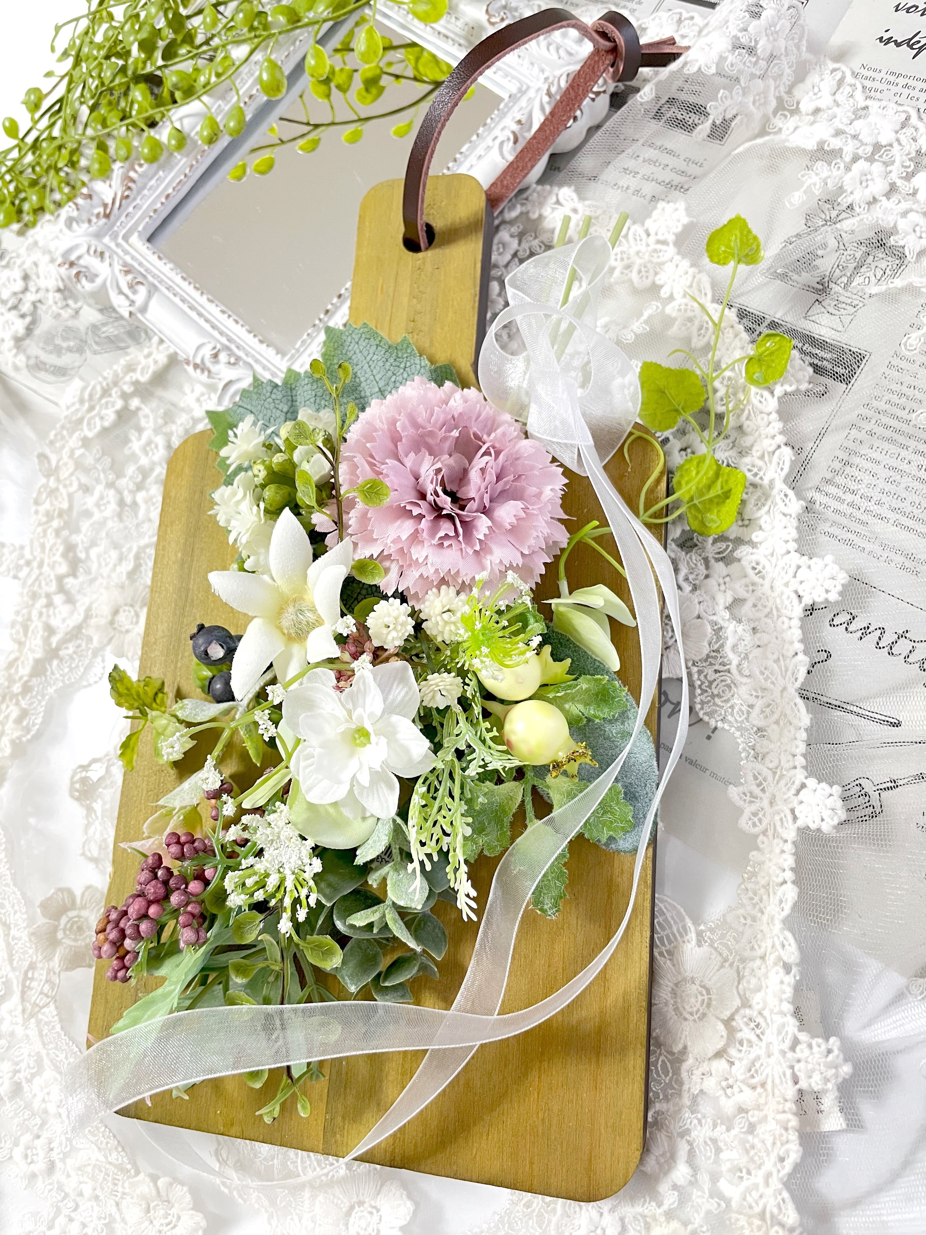 優しく咲いて枯れることのないアーティフィシャルフラワーグリーンと優しい色合いのカーネーションを使用し癒しの空間の彩りにスワッグ形のお花を流行りのフレームに合わせてデザインしました。