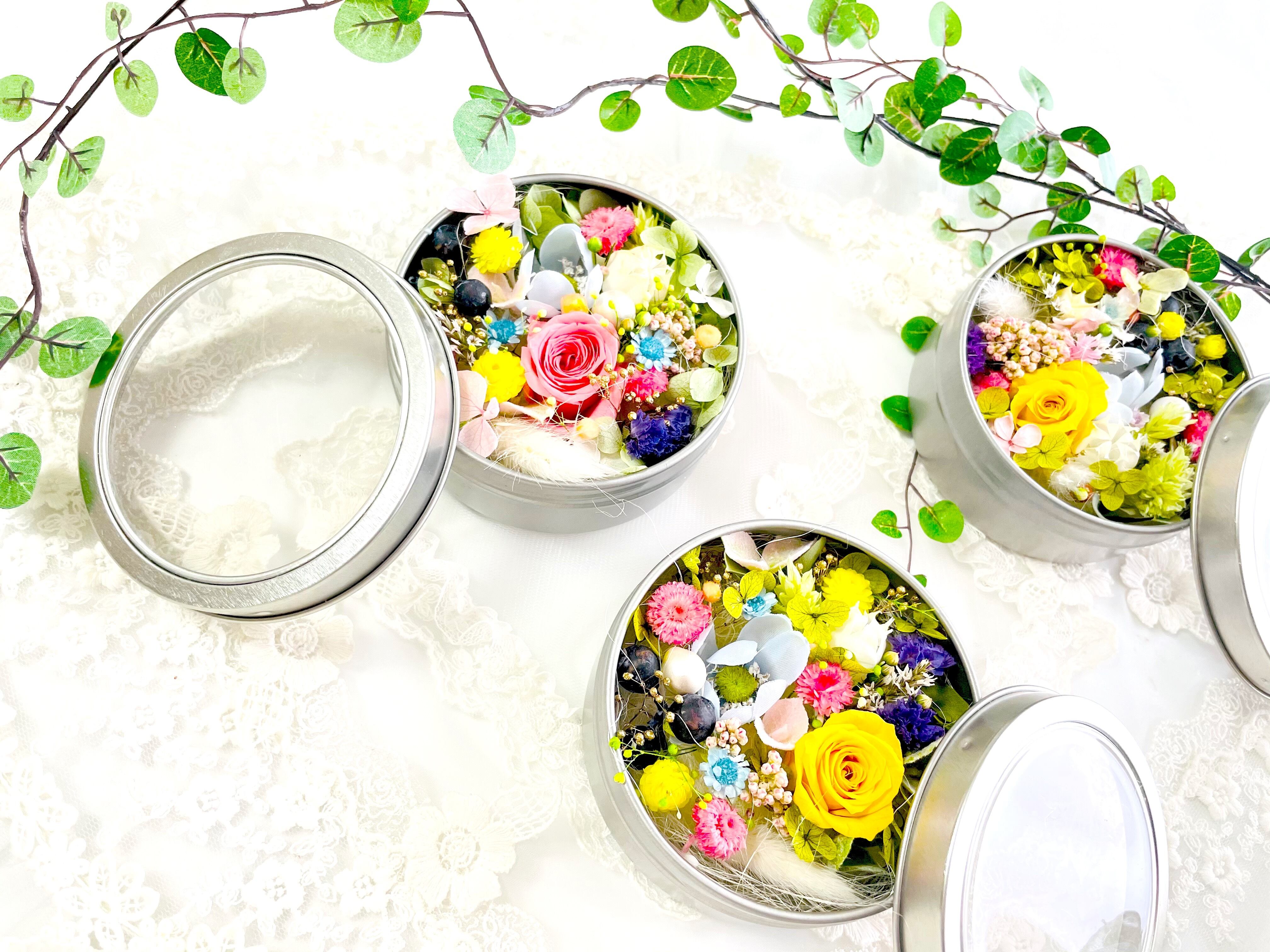 明るく繊細な色味のプリザーブドフラワー、かすみ草、リンスフラワー、紫陽花、プリザーブドローズなど