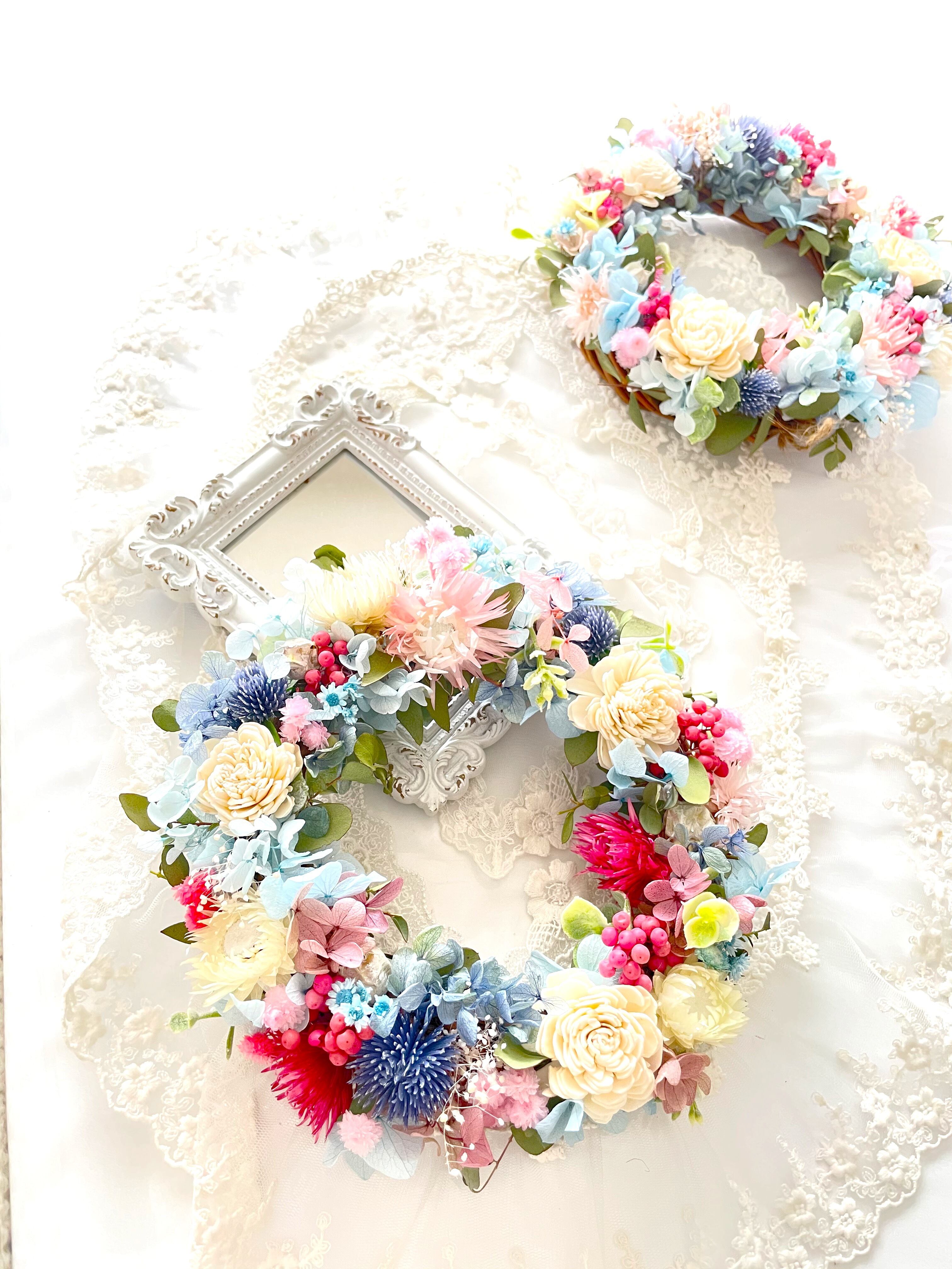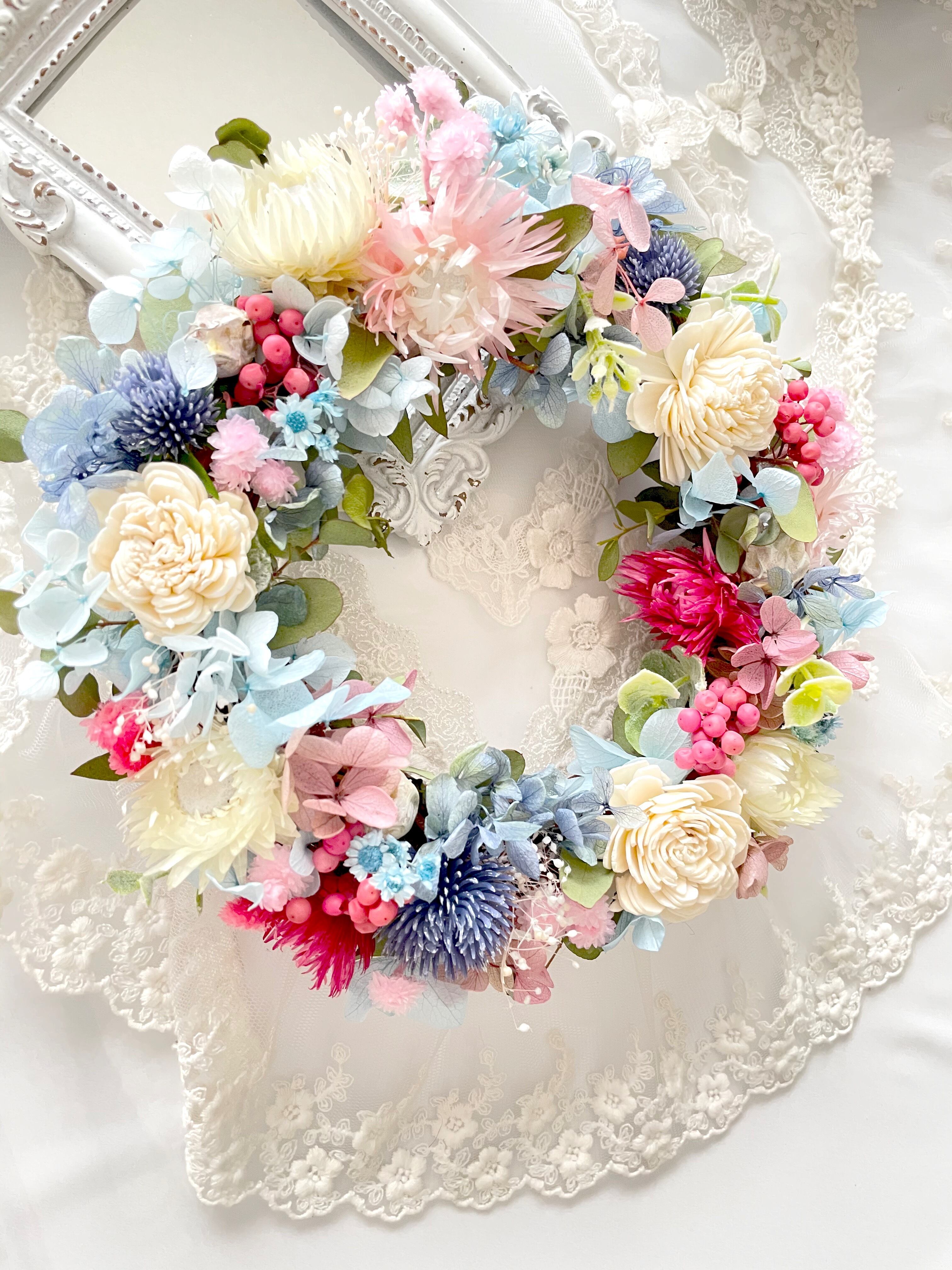 繊細な色味のプリザーブドフラワー紫陽花や人気のソラフラワー、アーティフィシャルフラワー、可愛い小花やグリーンを使用し癒しの空間の彩りにリースをデザインしました。