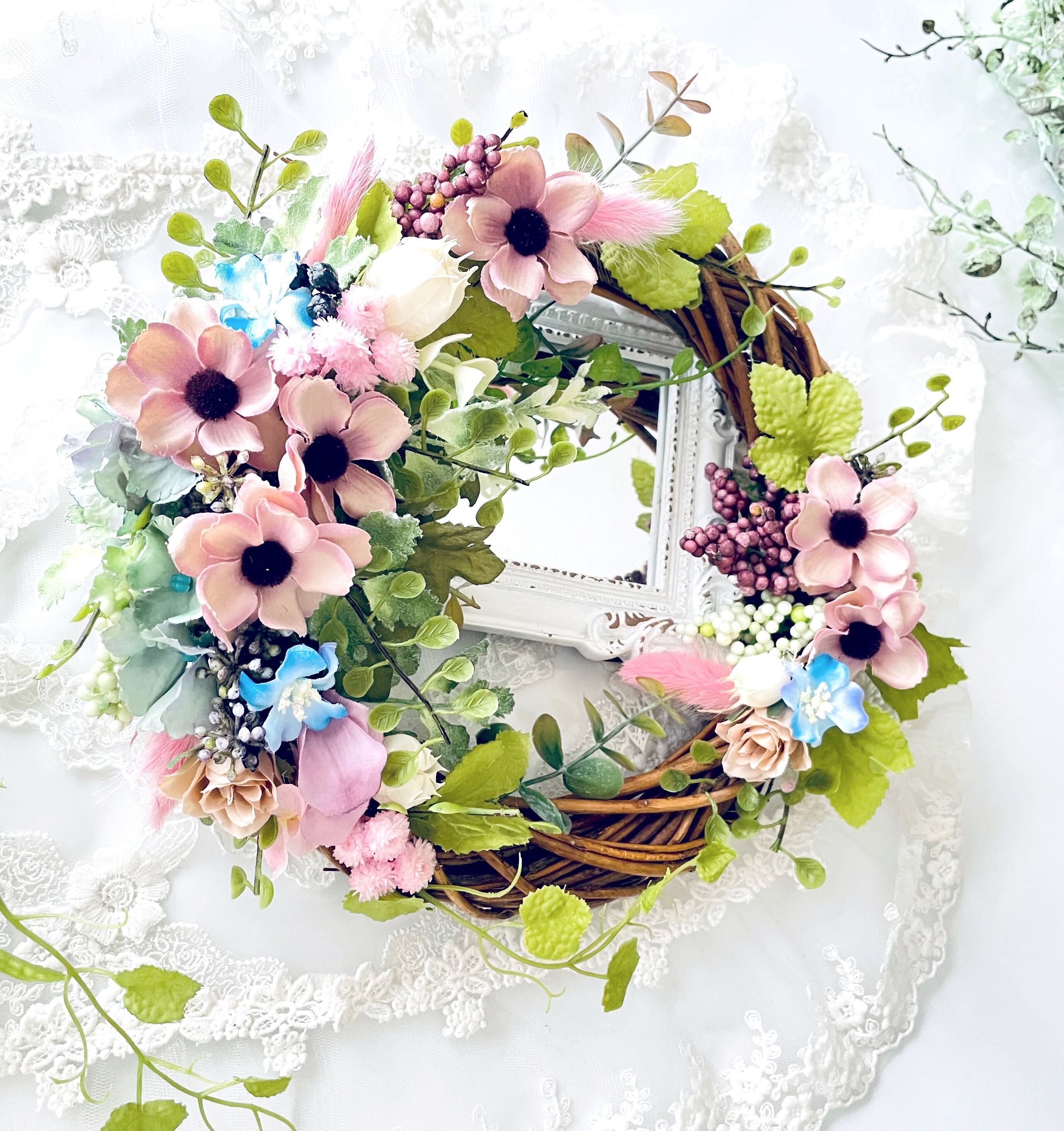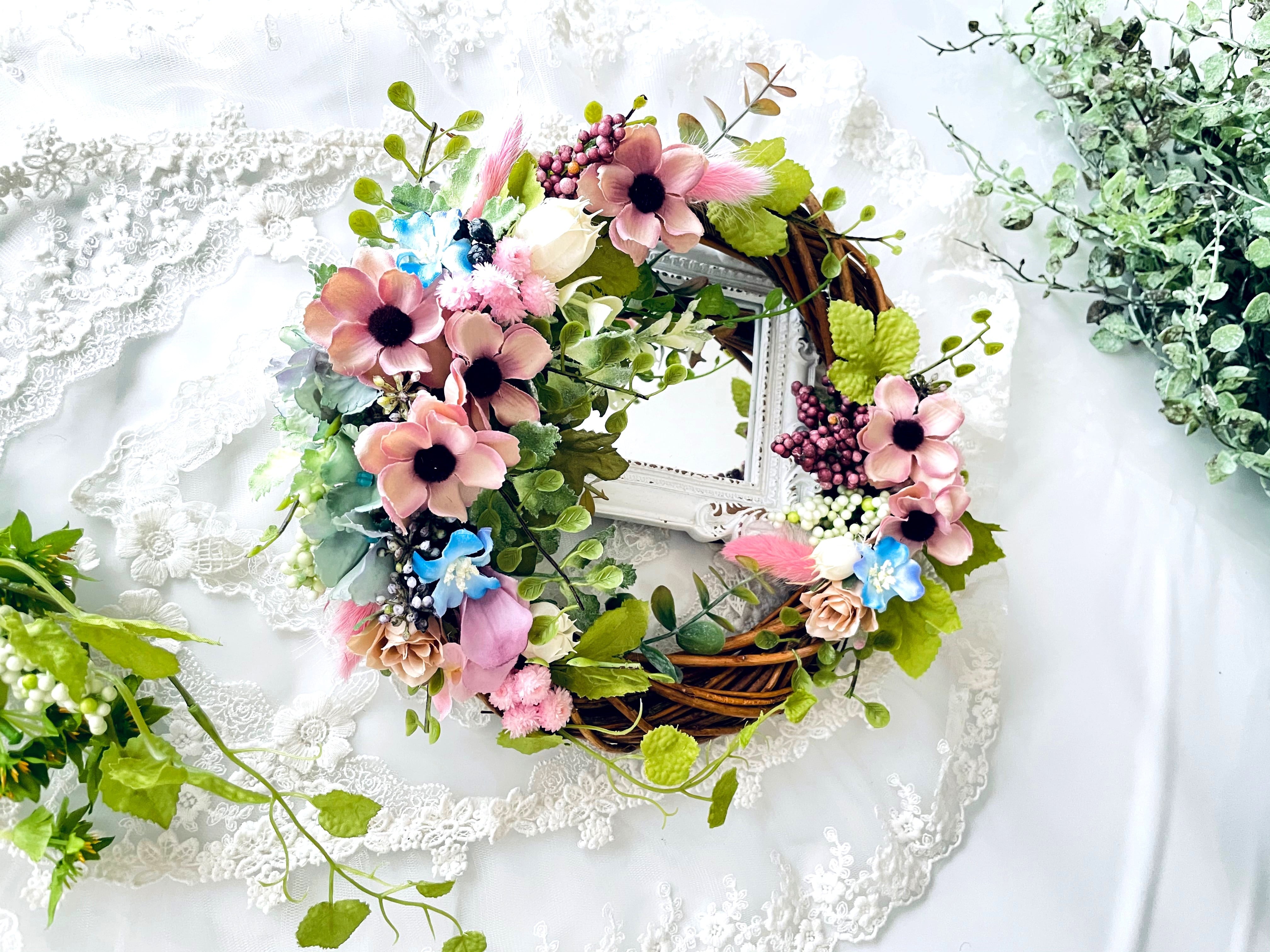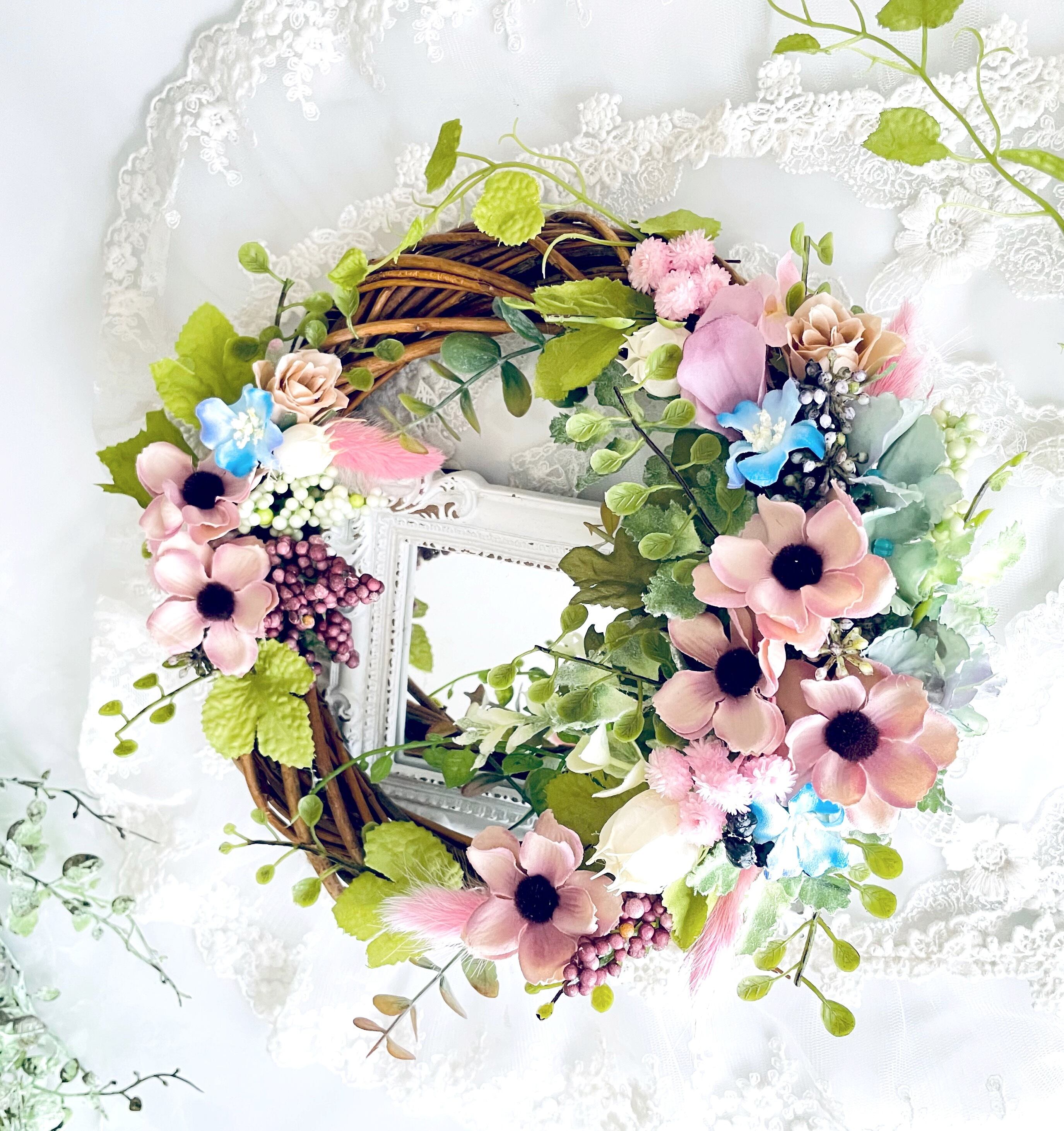 手作りキット*お家時間*季節を彩るモーヴカラーアネモネと薔薇のグリーンガーデンリース