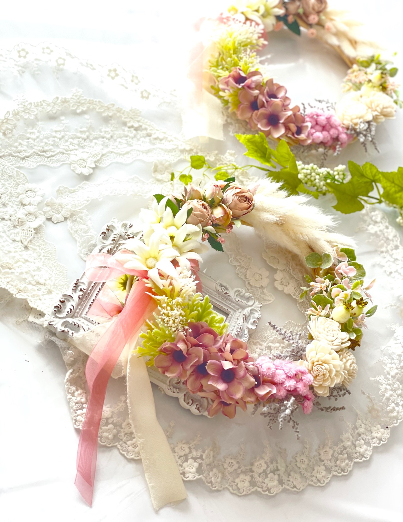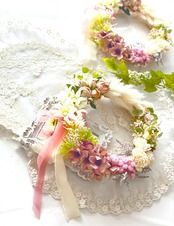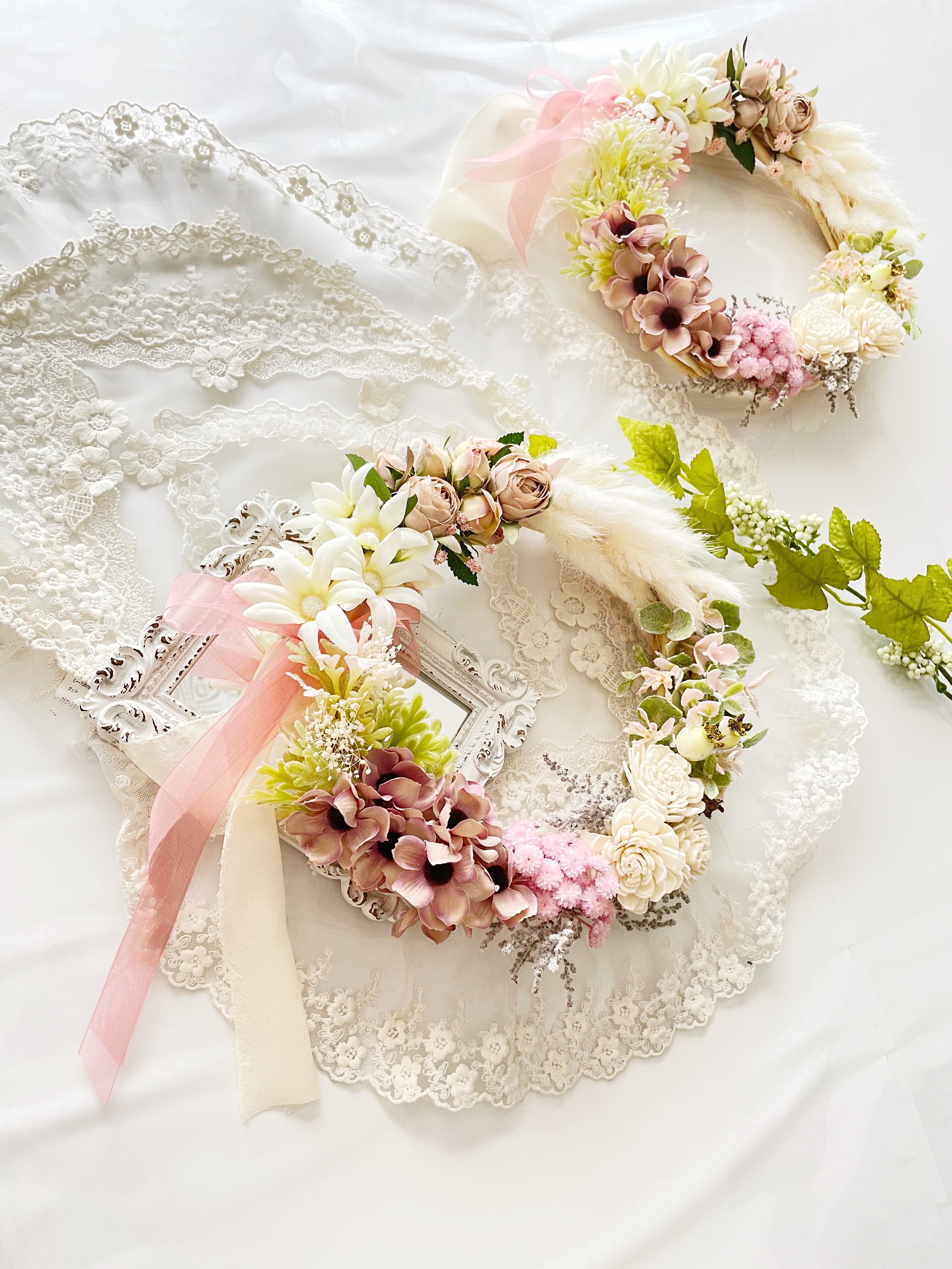 高級アーティフィシャルフラワーと繊細なプリザーブド加工された花材を使用し癒しの空間の彩りにリースをデザインしました。