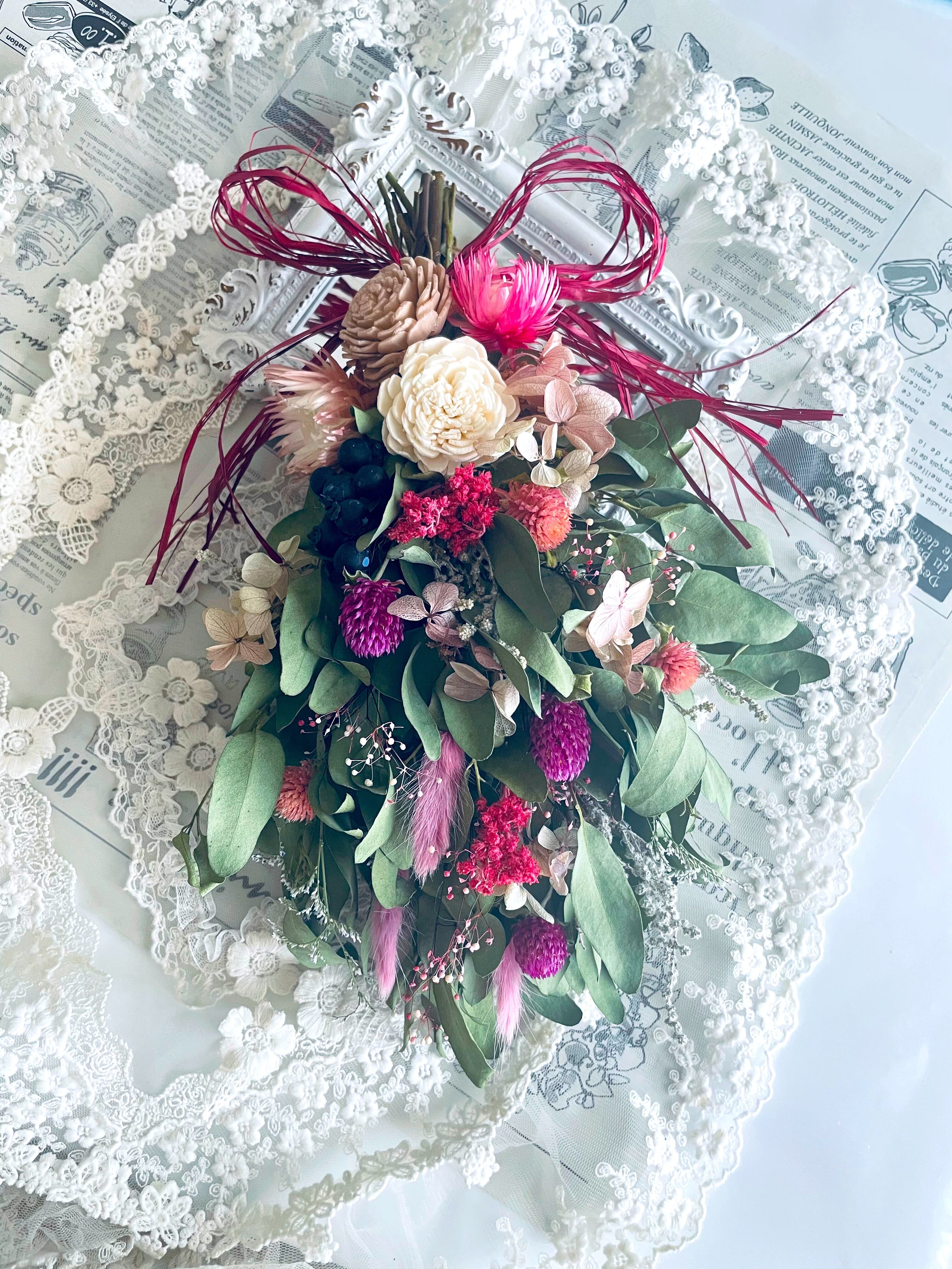 香りが心地よいドライユーカリとプリザーブドフラワー花材やドライの千日紅などオータムカラーのスワッグ゜・*:.。..。.:*・*:.。. .。.:*・゜゜・*