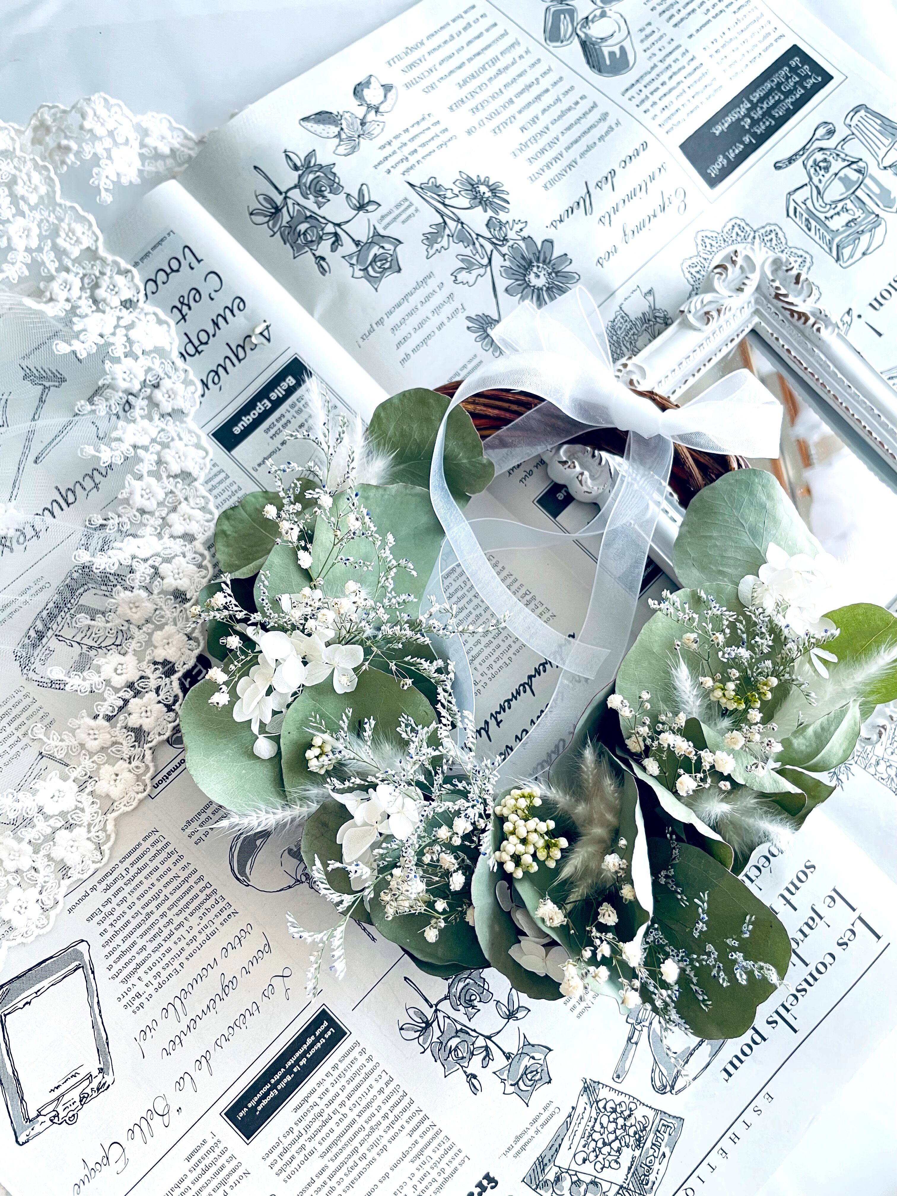 可愛い丸葉のポポラスドライユーカリとテールリード、繊細で綺麗なかすみ草とブルーファンタジアを丁寧に貼り付け