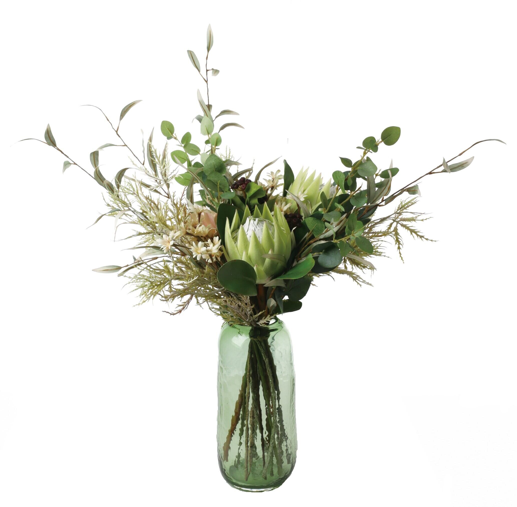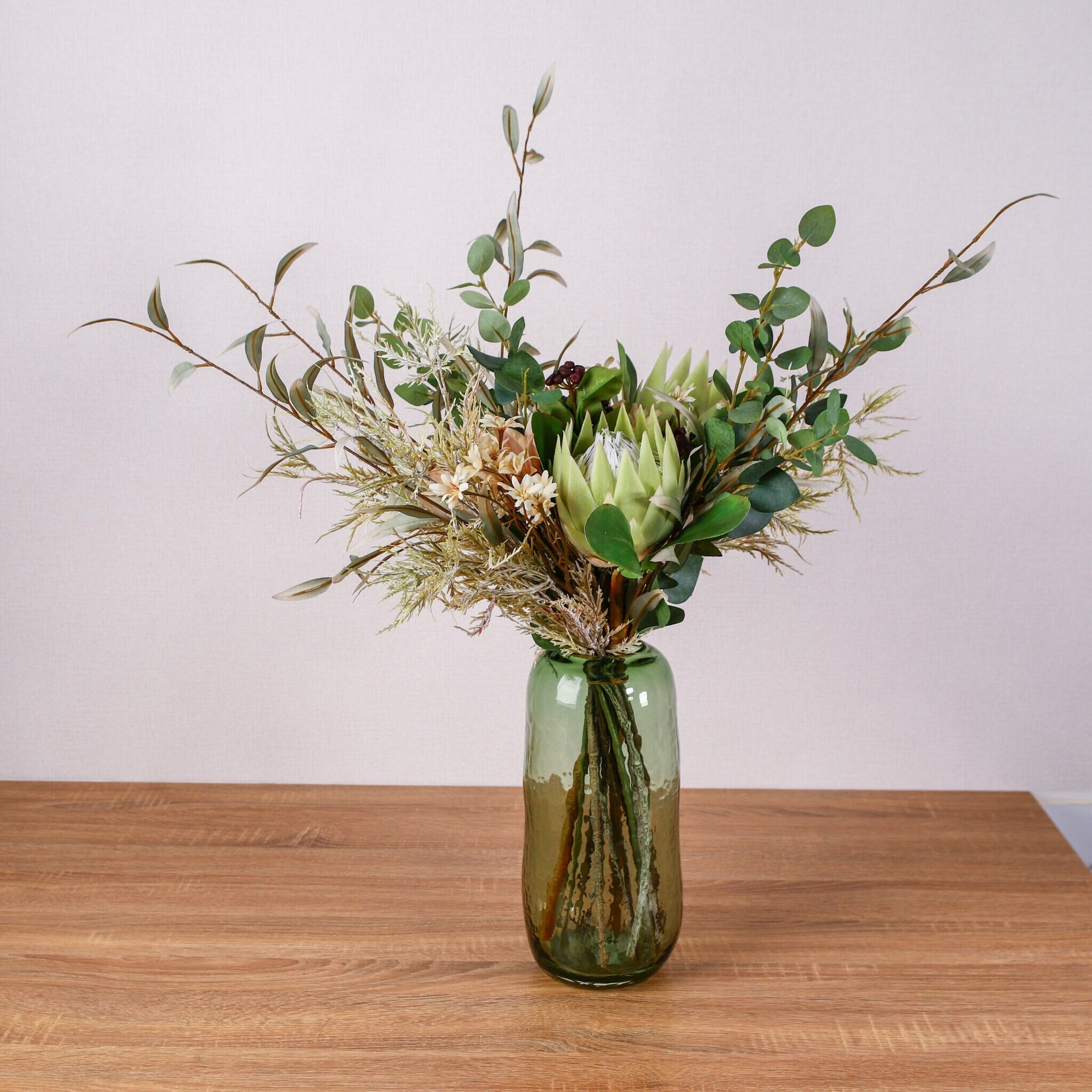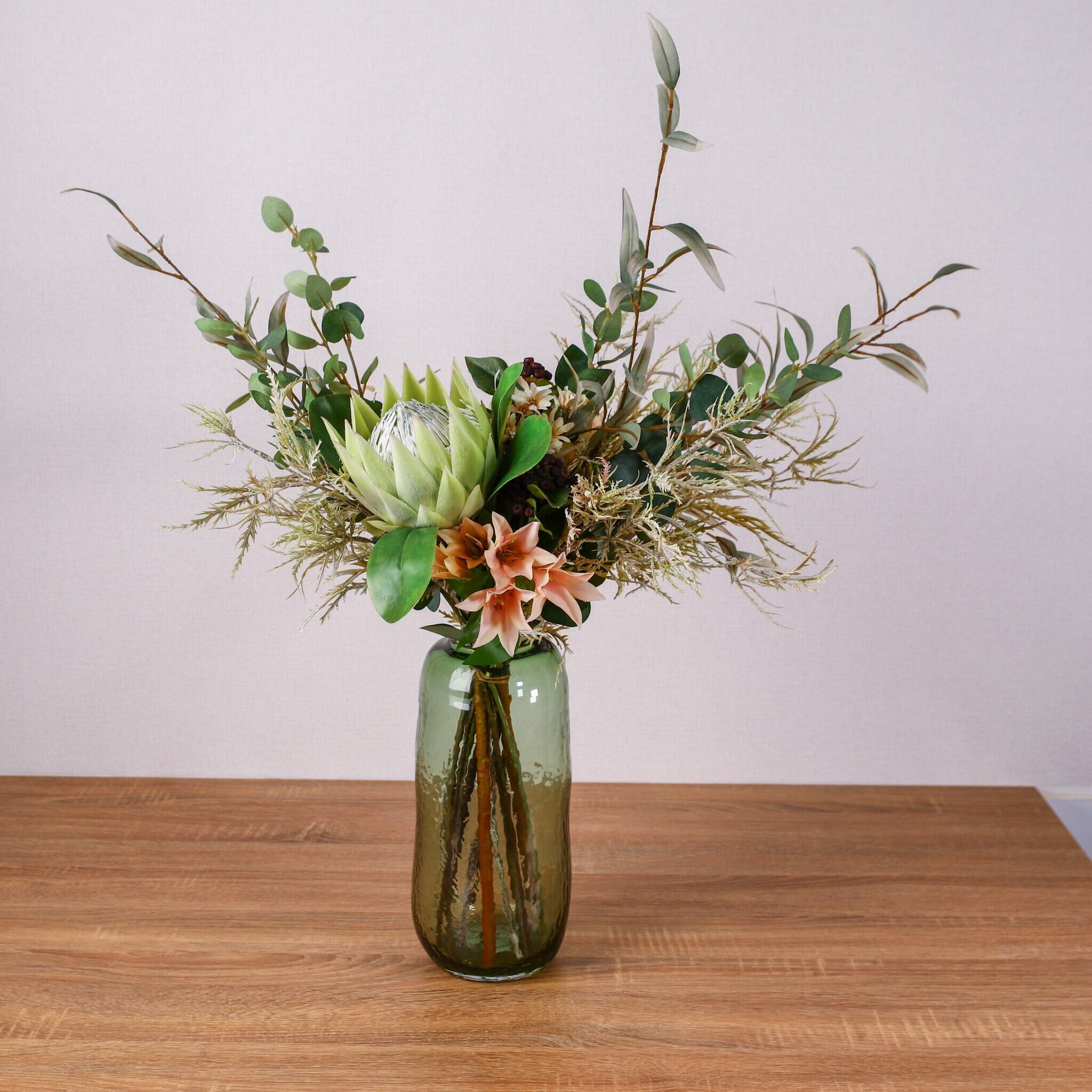 優しさのある小花と強いイメージのあるプロテアの組み合わせでナチュラルなインテリアにも、モダンなインテリアにも映えるさわやかな印象のアレンジに仕上げました。