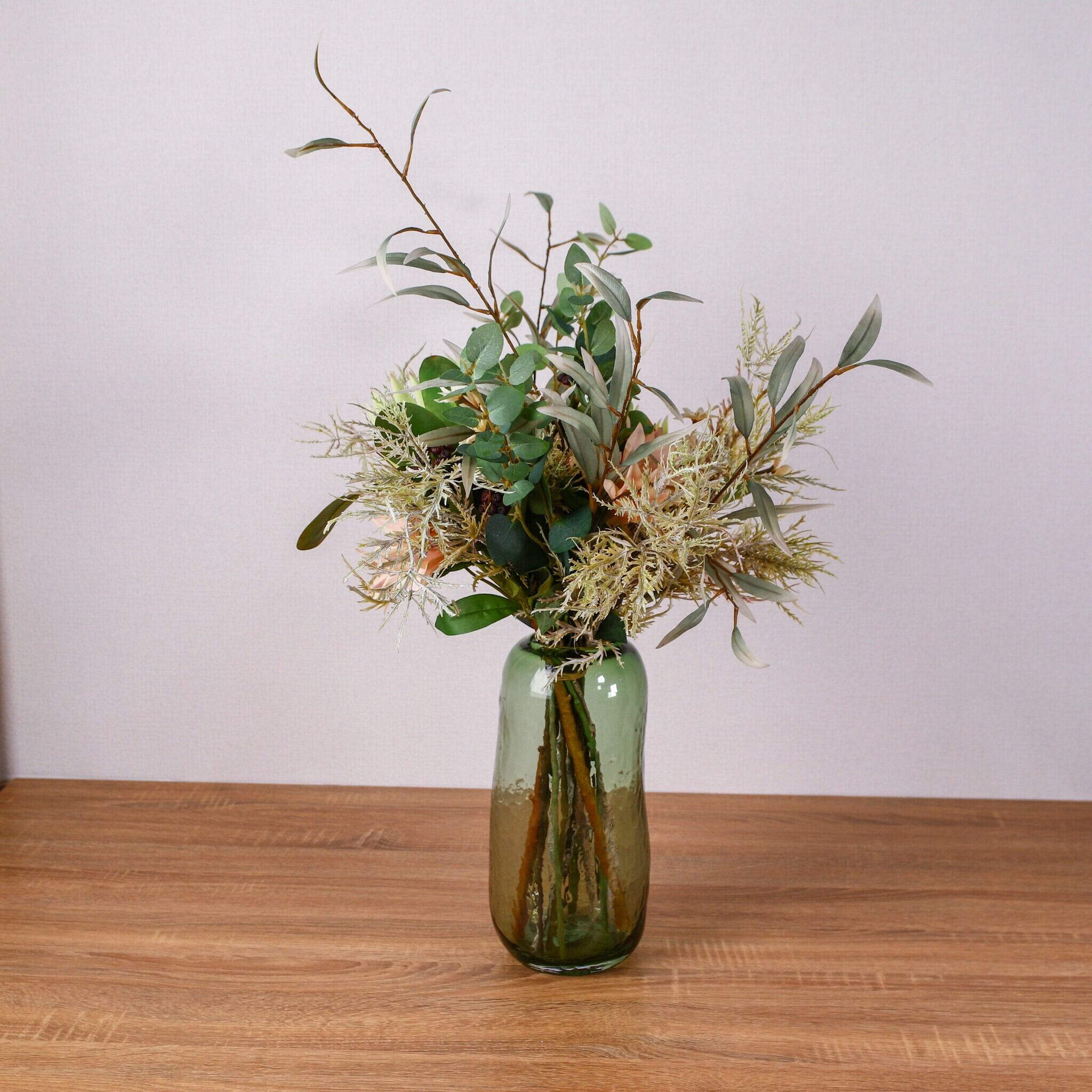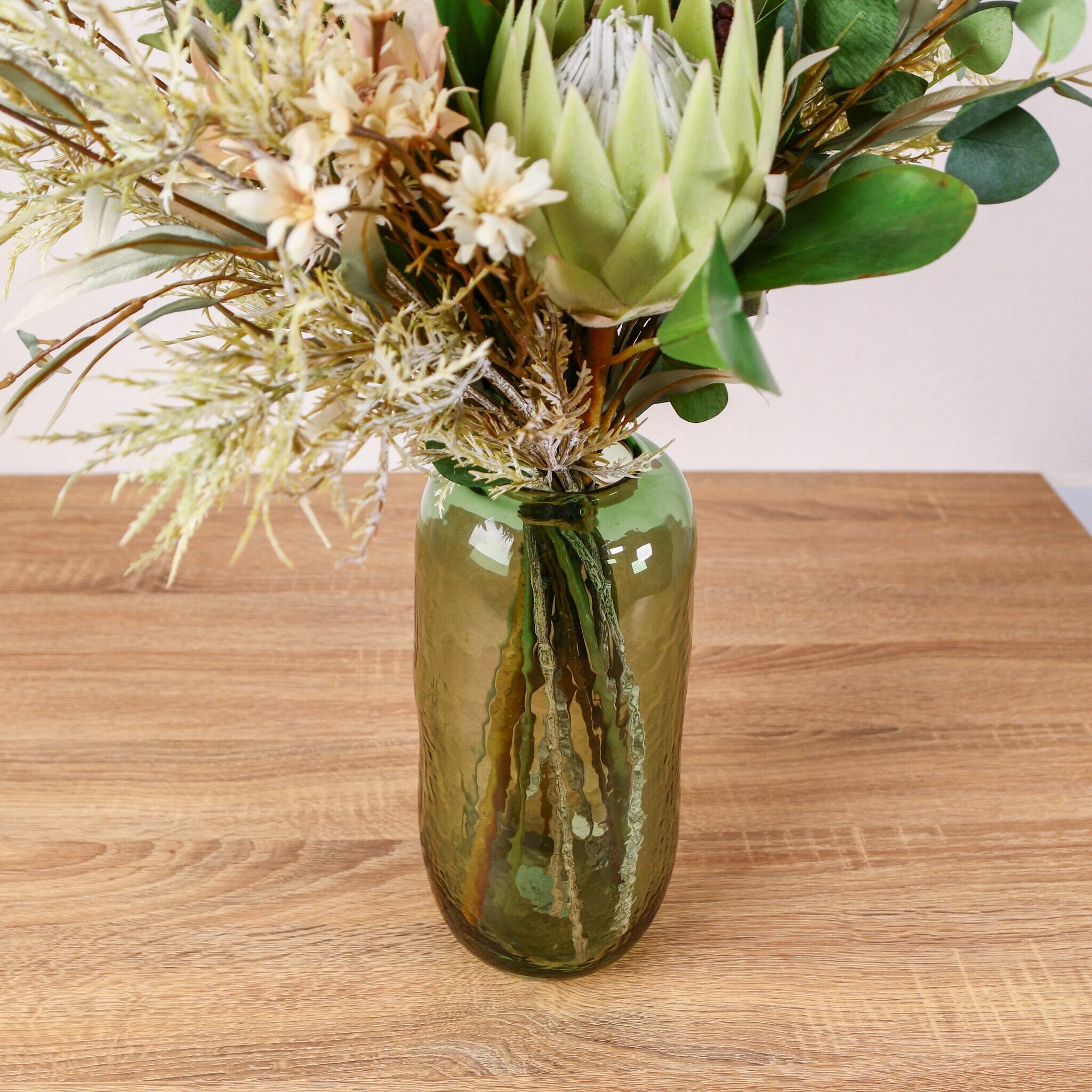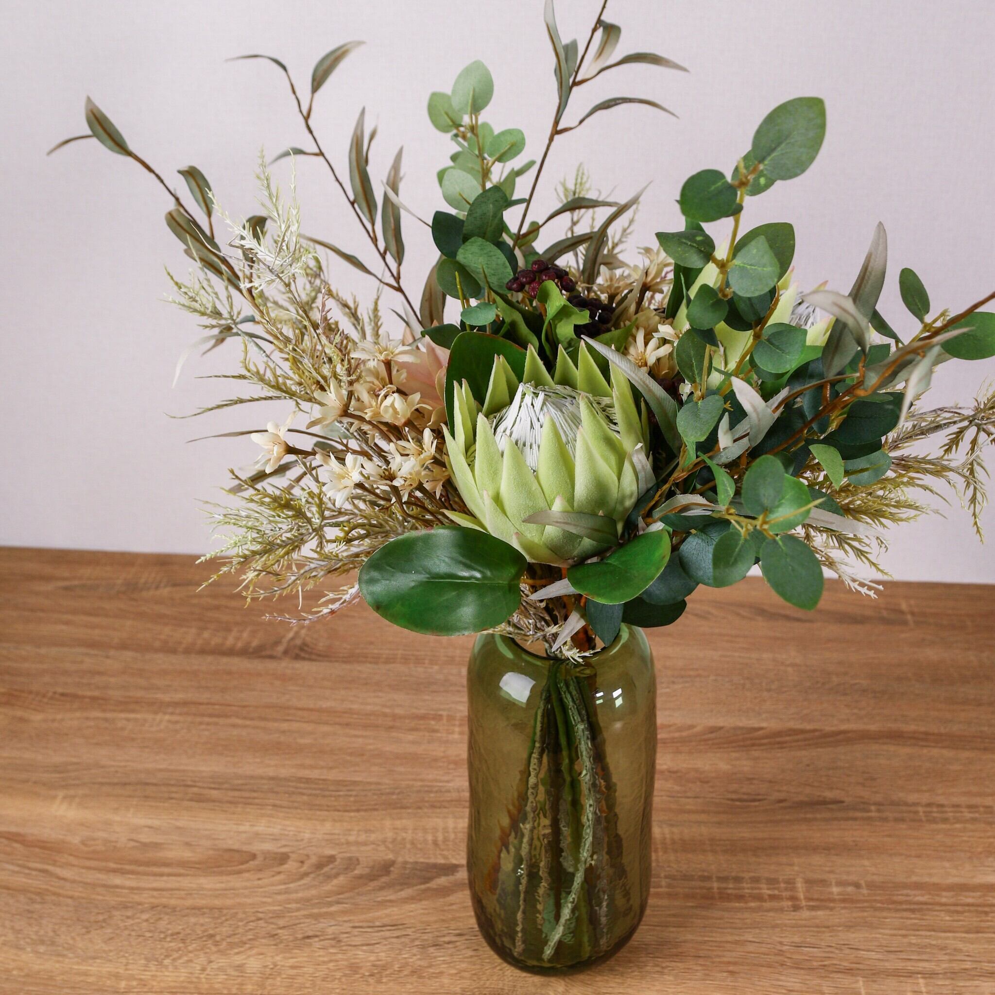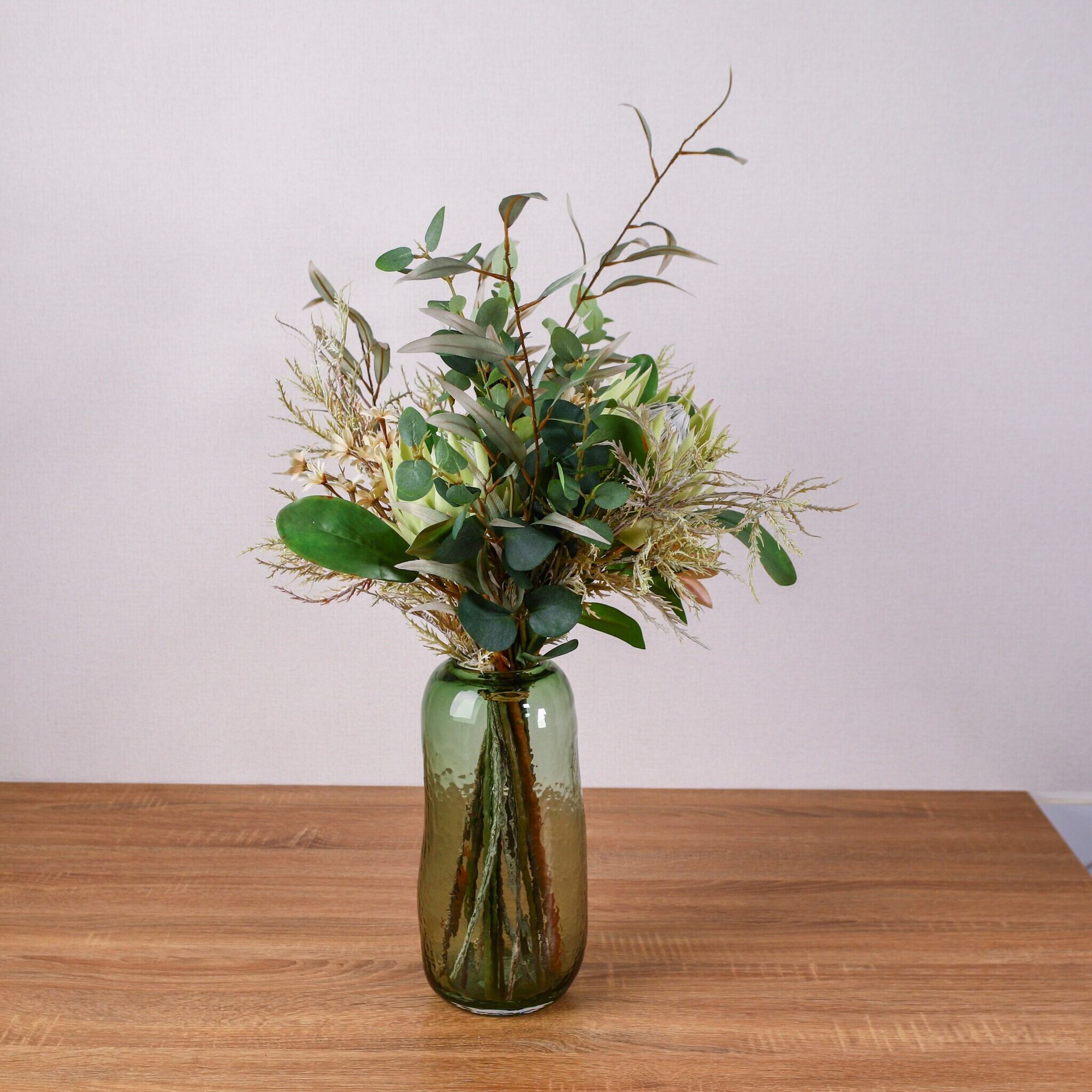 優しさのある小花と強いイメージのあるプロテアの組み合わせでナチュラルなインテリアにも、モダンなインテリアにも映えるさわやかな印象のアレンジに仕上げました。