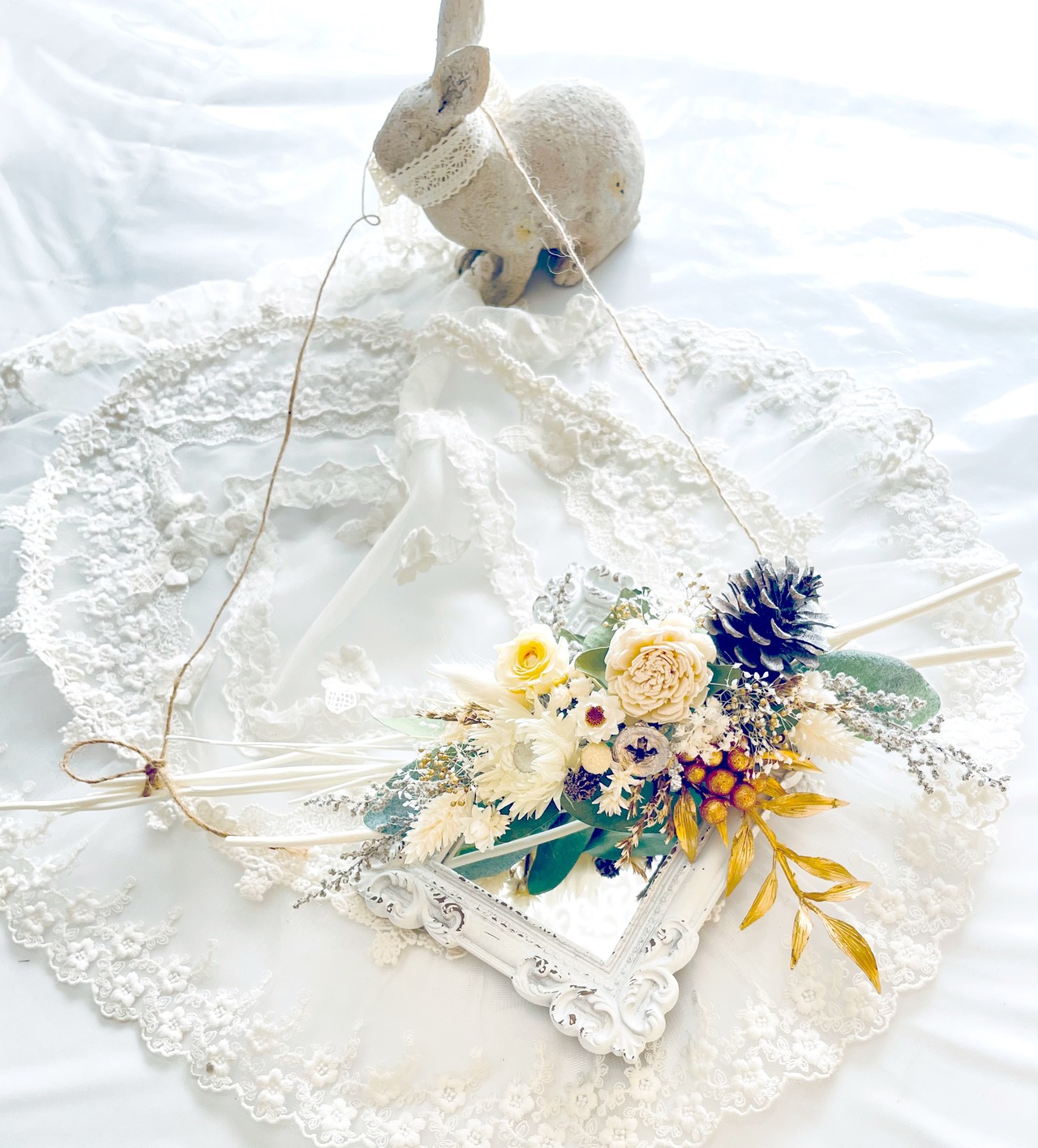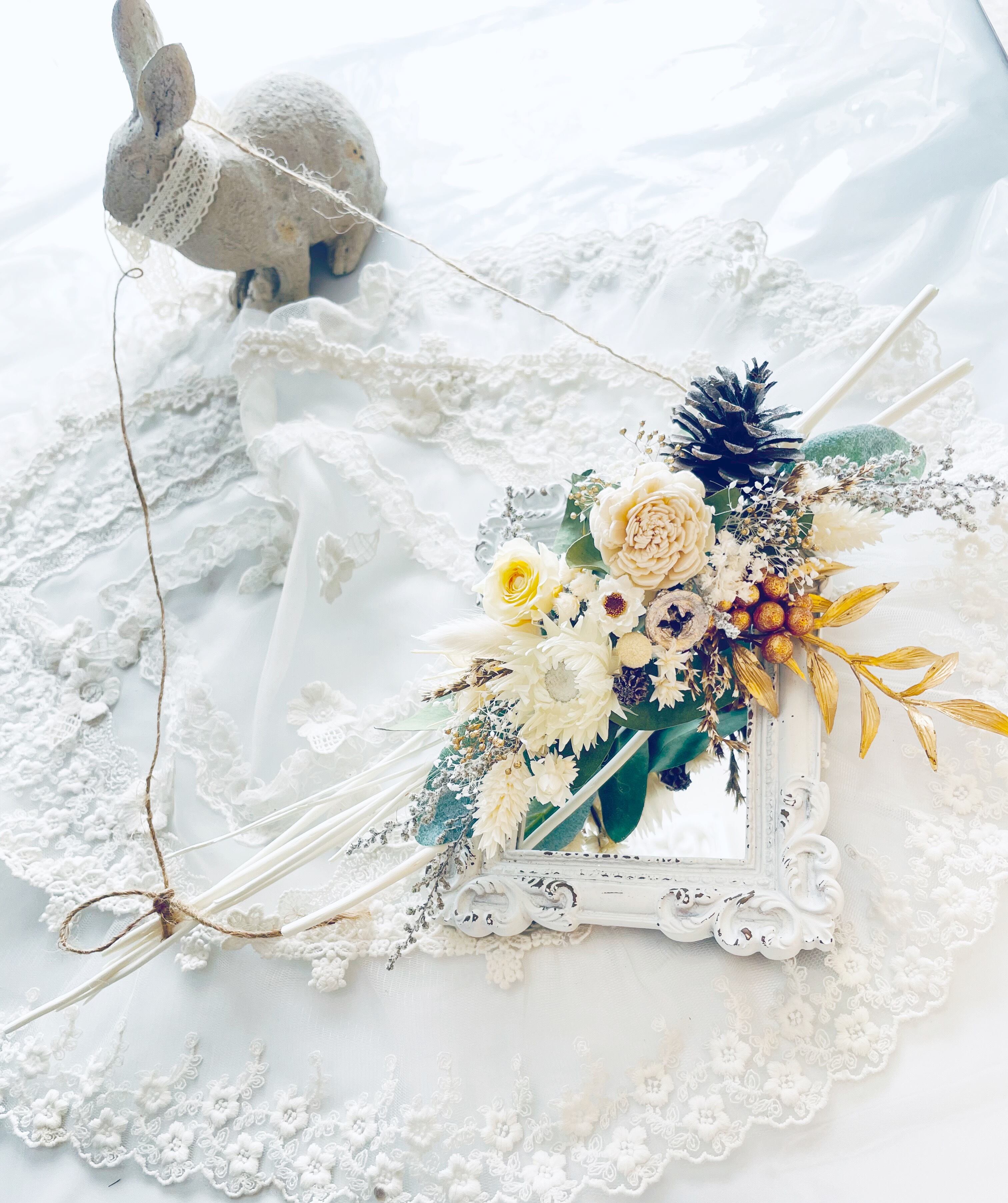アーティフィシャルフラワー、造花とプリザーブドフラワー、ドライフラワーをミックスしながら癒しの空間の彩りに素敵なホワイトクリスマススワッグをデザインしました。