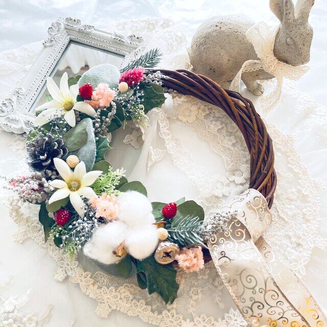 フランネルフラワーとコットンフラワーで可愛く彩るフェミニンなクリスマスリース