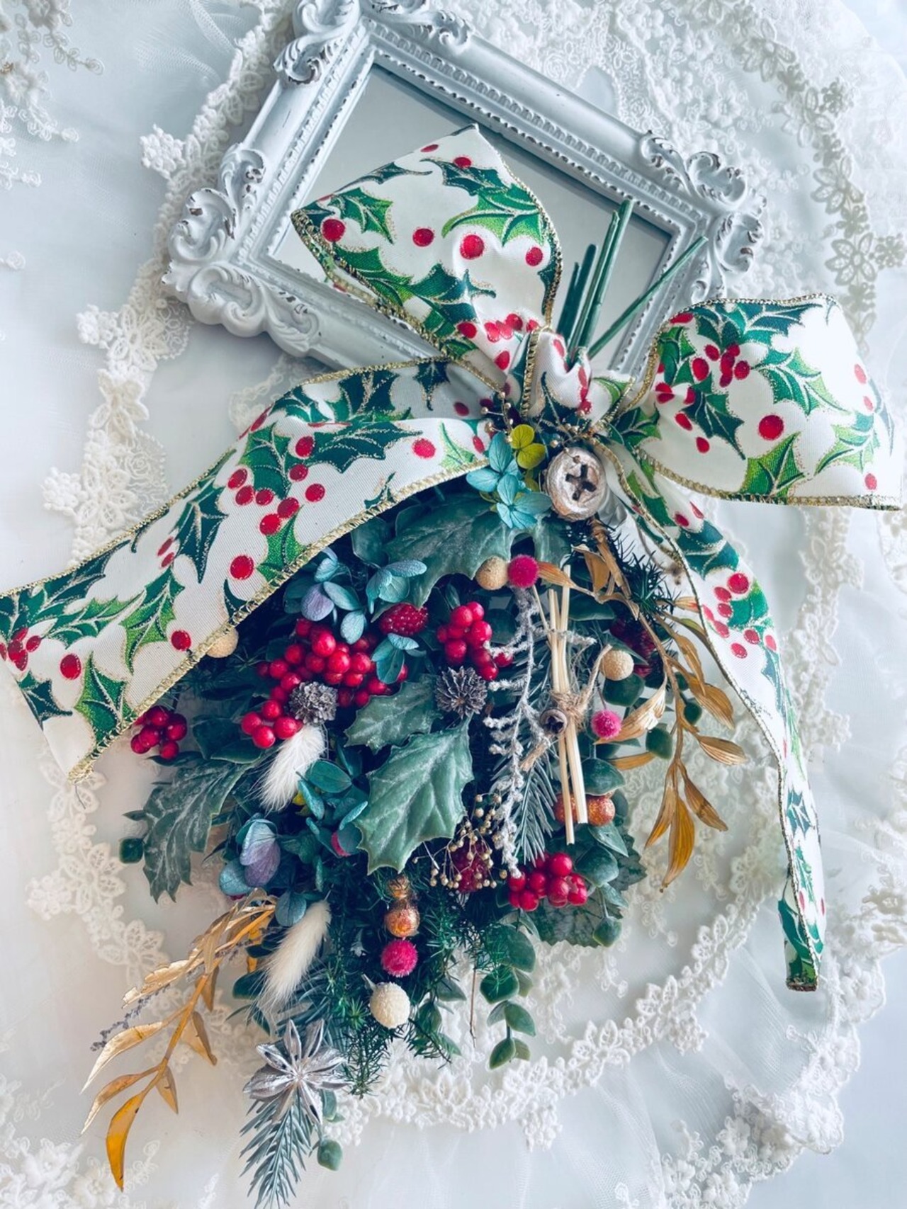 アーティフィシャルフラワー、造花とプリザーブドフラワー、ドライフラワーをミックスしながら癒しの空間の彩りに素敵なクリスマススワッグをデザインしました。
