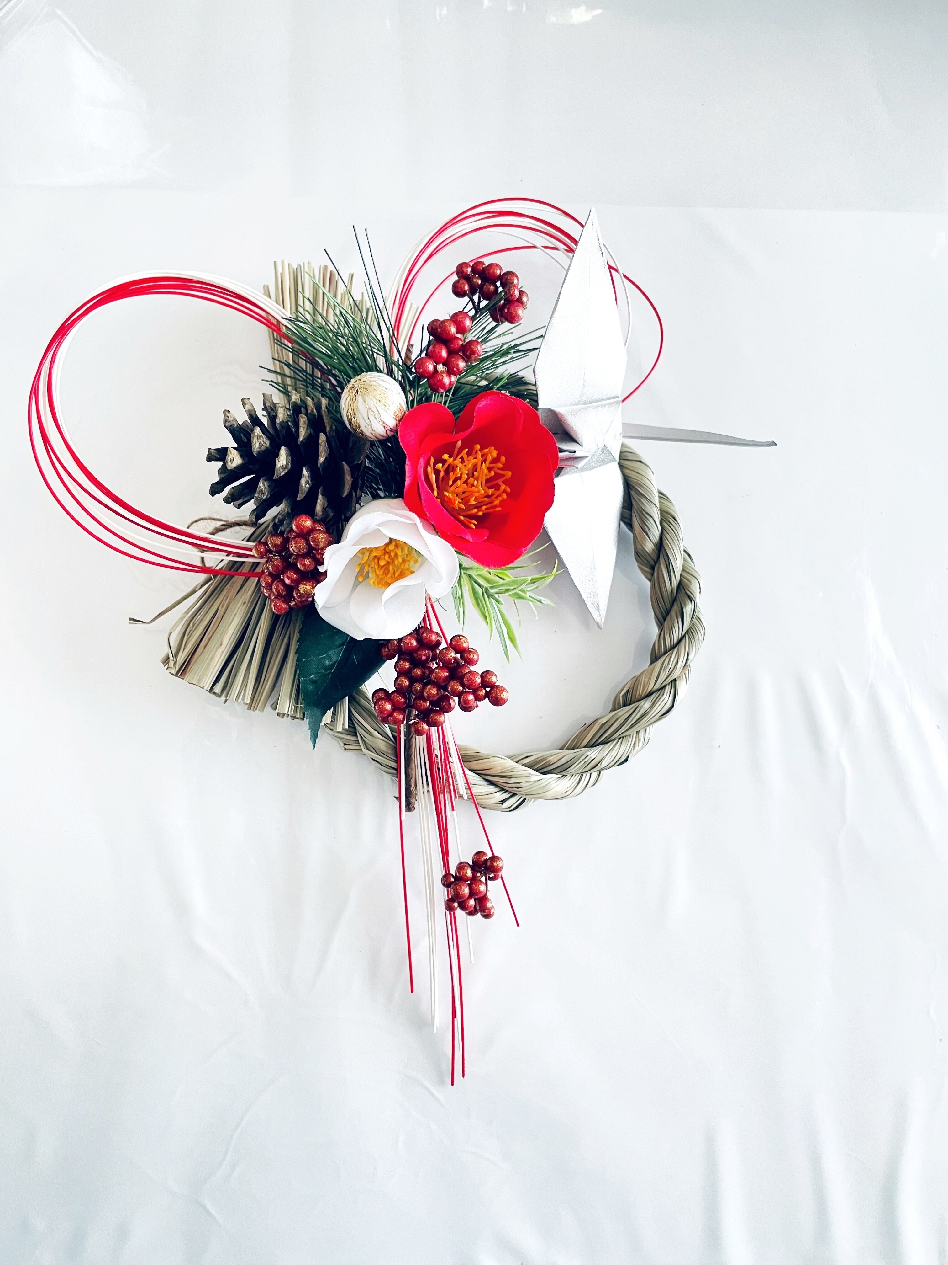 早割*紅白椿と鶴で祝う新年のしめ縄飾り