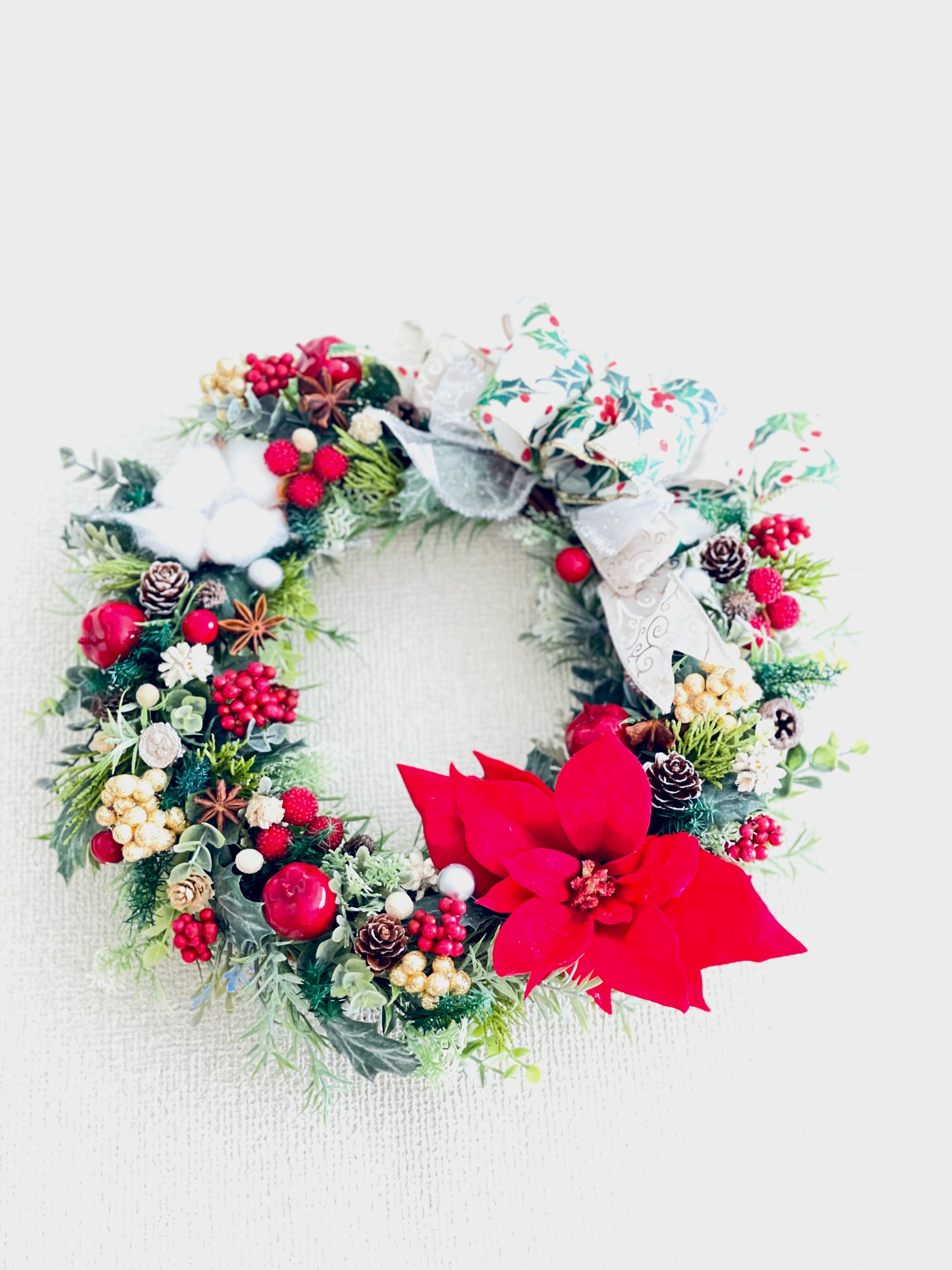 新作のリボンを華やかに重ねアーティフィシャルフラワーでクリスマスカラーのリースをデザインしました。
