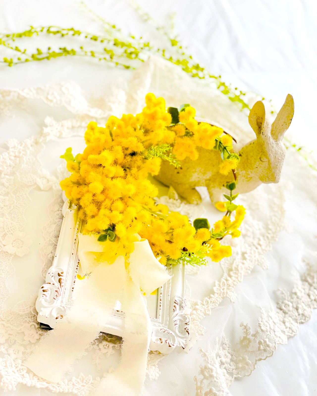 春を告げる優しい黄色のアーティフィシャルフラワーのミモザのリースにリボンを添えて。