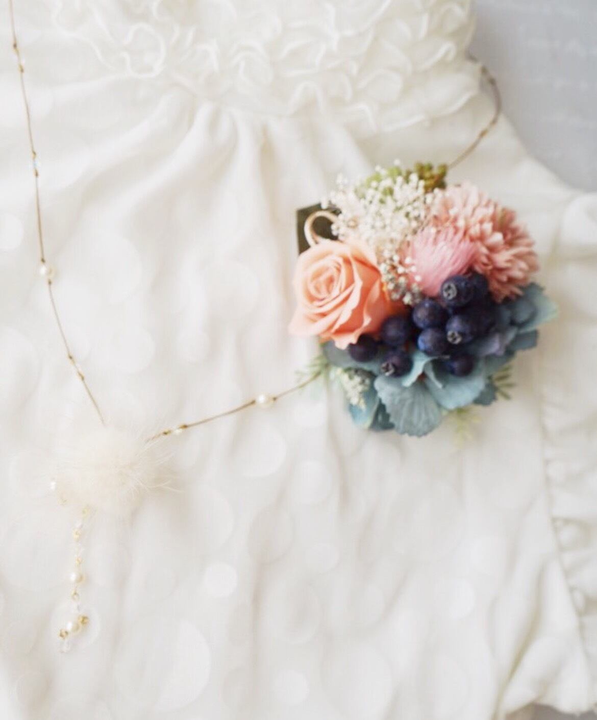 繊細なプリザーブドフラワーとアーティフィシャルフラワー、丁寧に作られた造花のお花をコサージュにデザインしました。