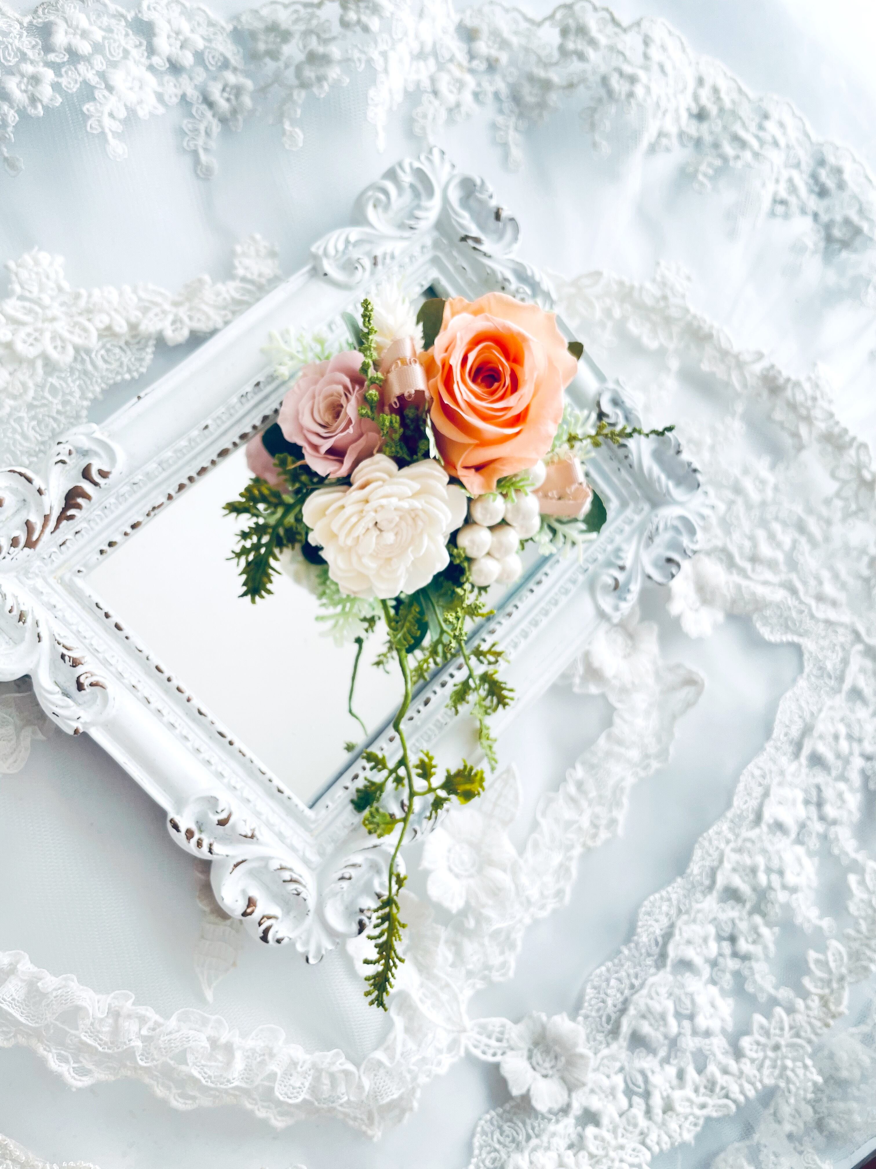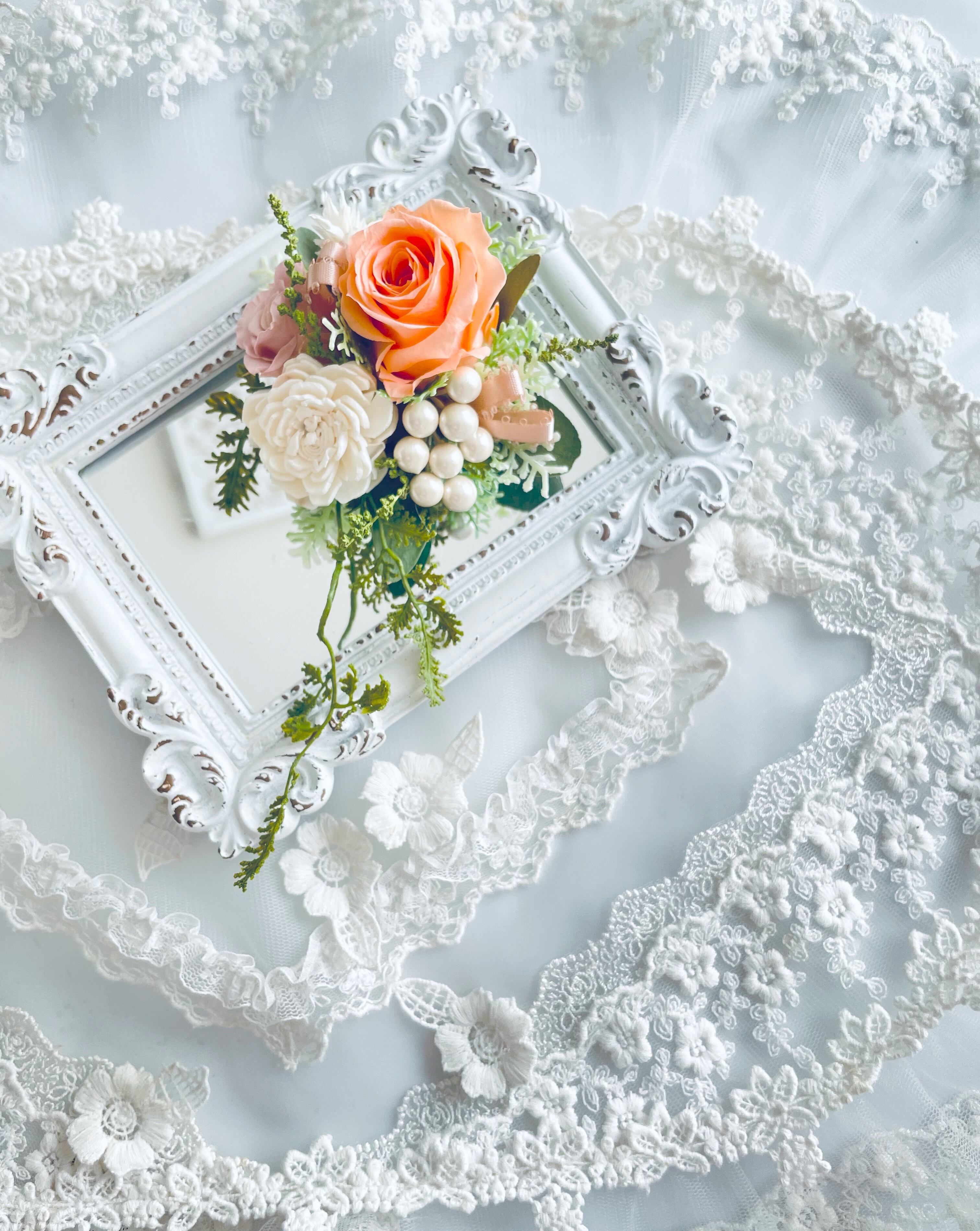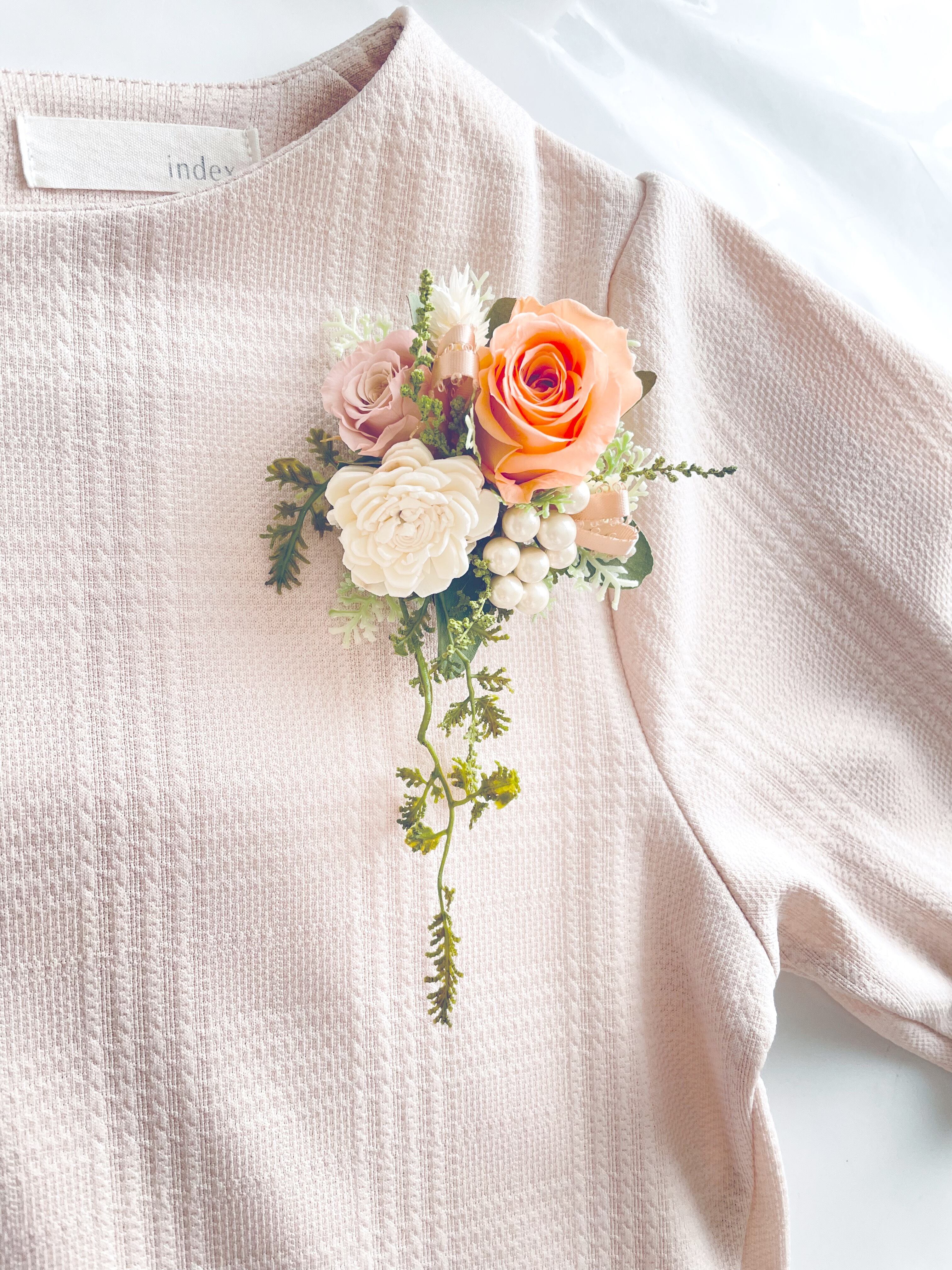 ジョリーコーラルのプリザーブドローズコサージュにパールを添えて。