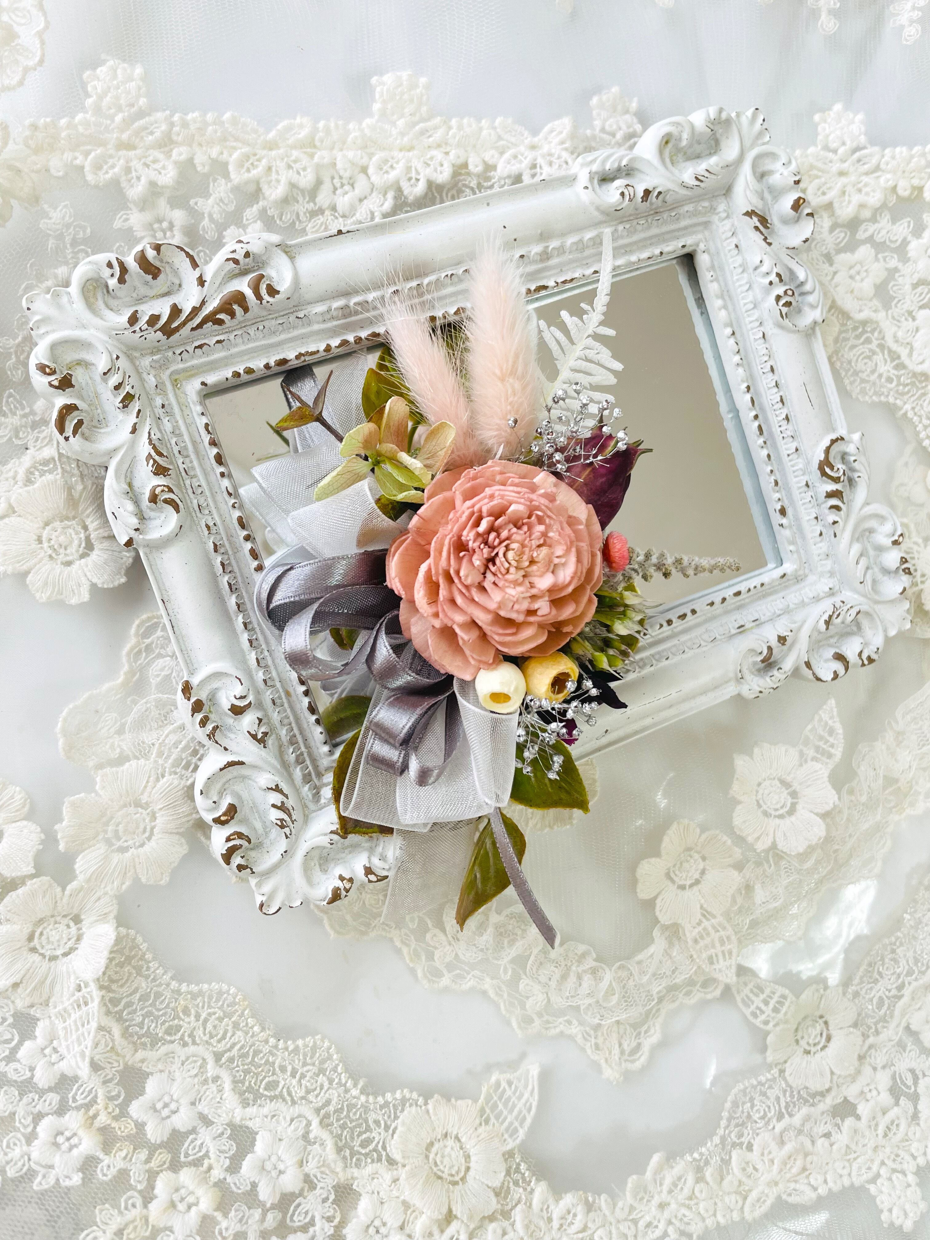 春の新作は ソラローズにプリザーブド花材を添えたナチュラルなコサージュ゜゜・*:.。.