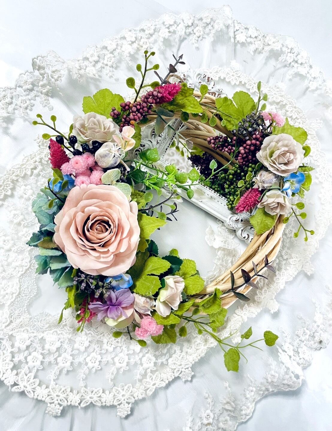 高級アーティフィシャルフラワーと繊細なプリザーブド加工された花材を使用し癒しの空間の彩りにリースをデザインしました。