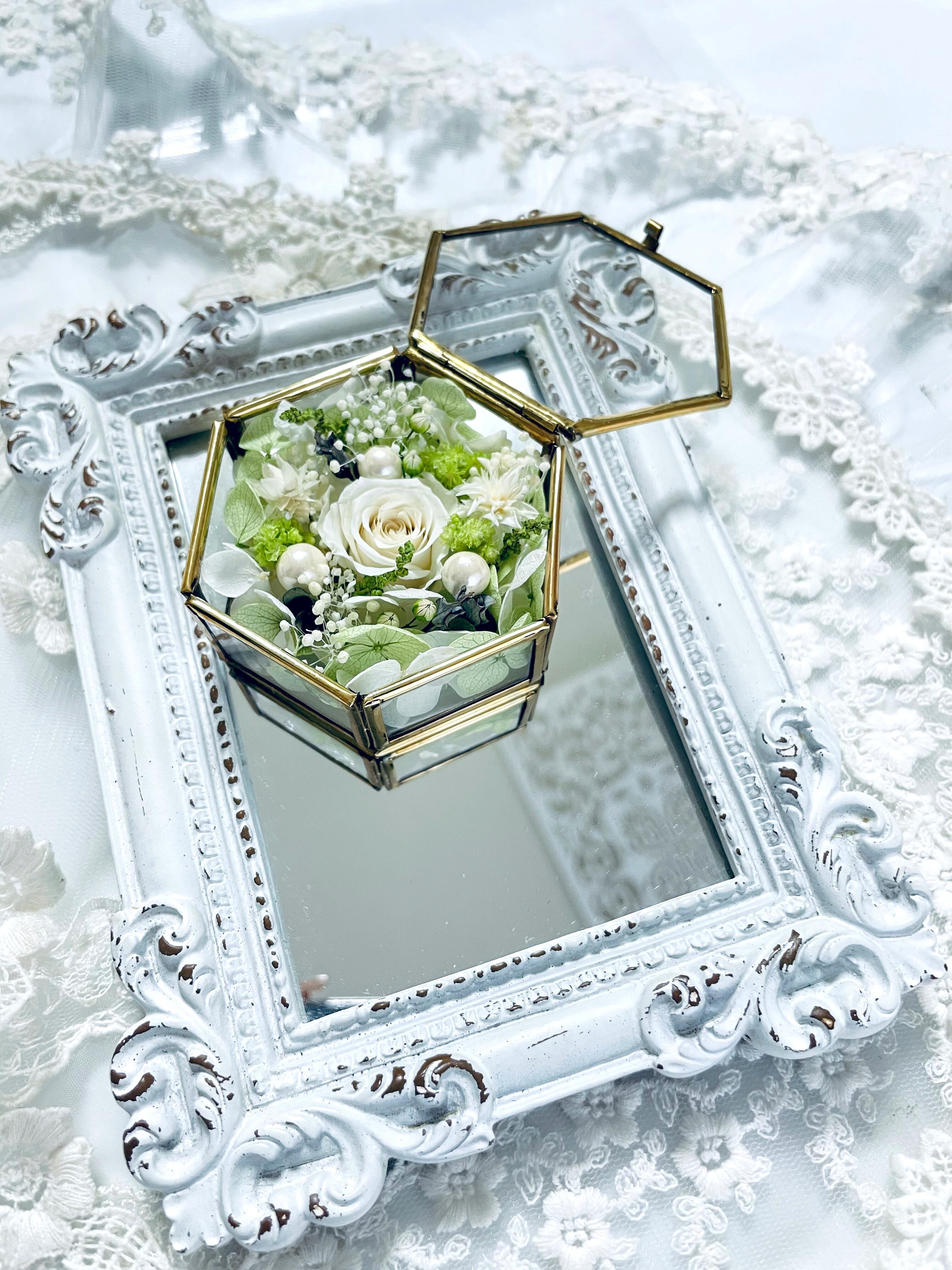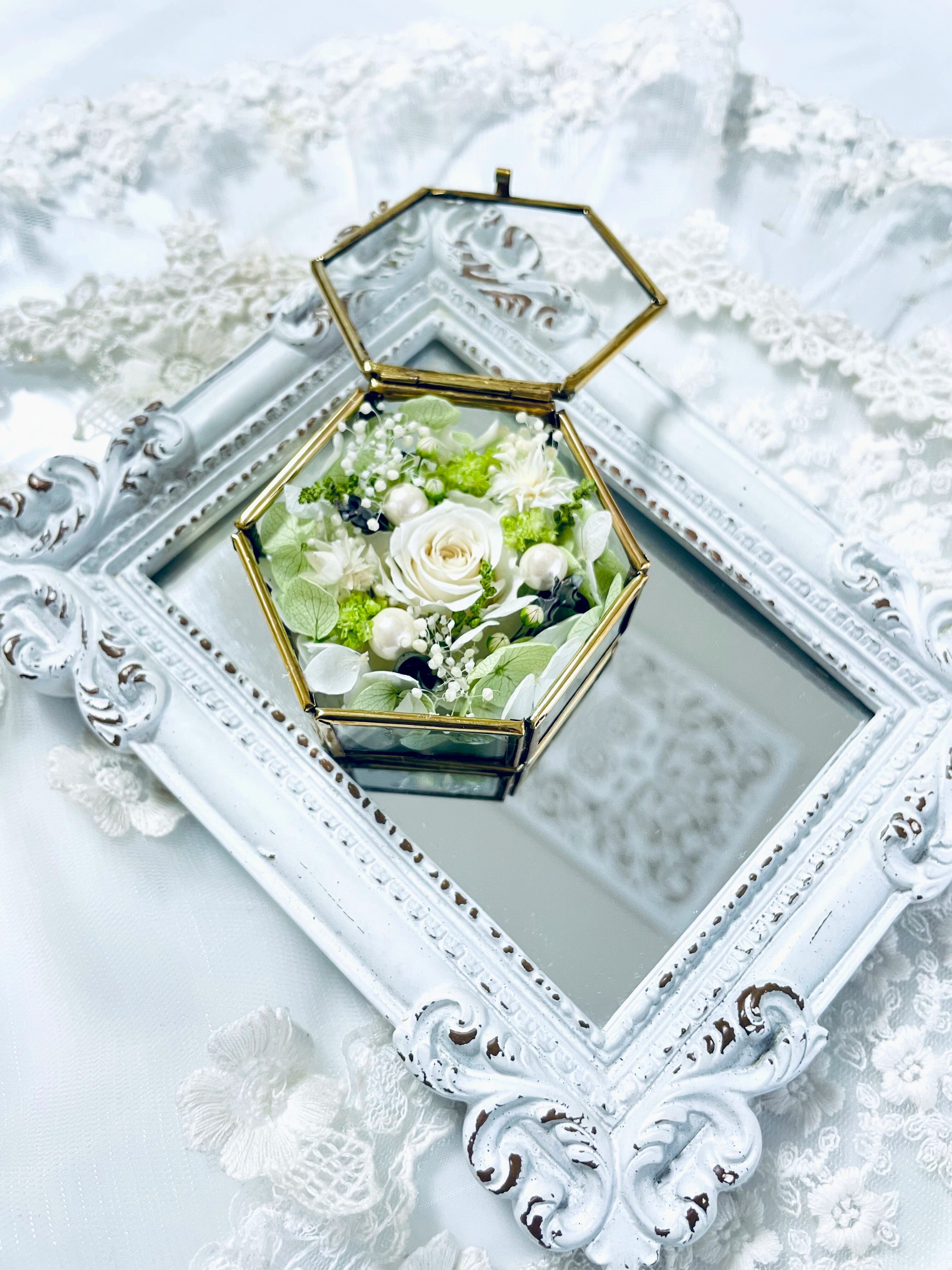 綺麗なプリザーブドフラワーローズホワイトSサイズを中心に愛を込めて。