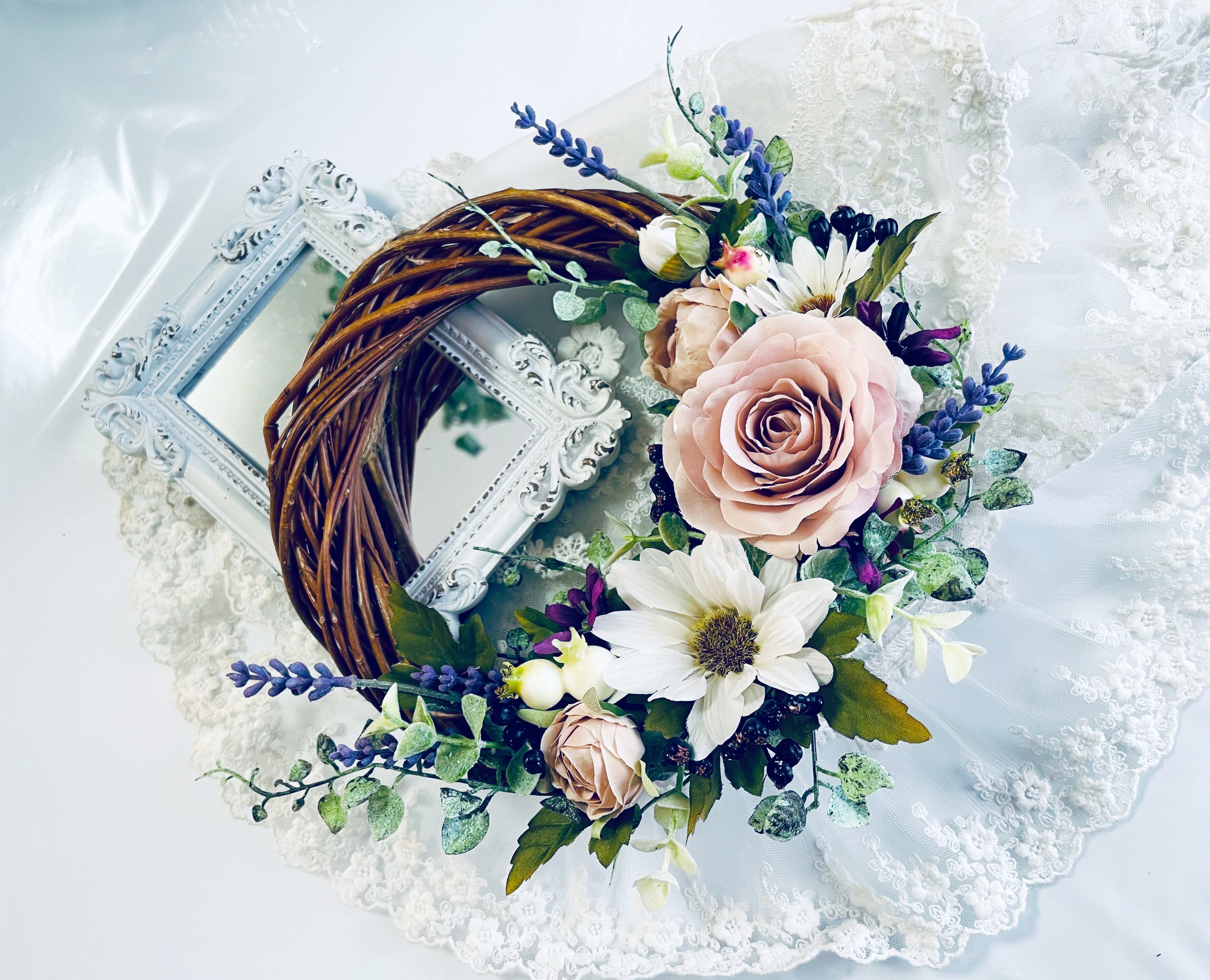 ラッピング無料*記念日*結婚式*誕生日*人気のモーヴカラーの薔薇とナチュラルアーティフィシャルフラワーリース