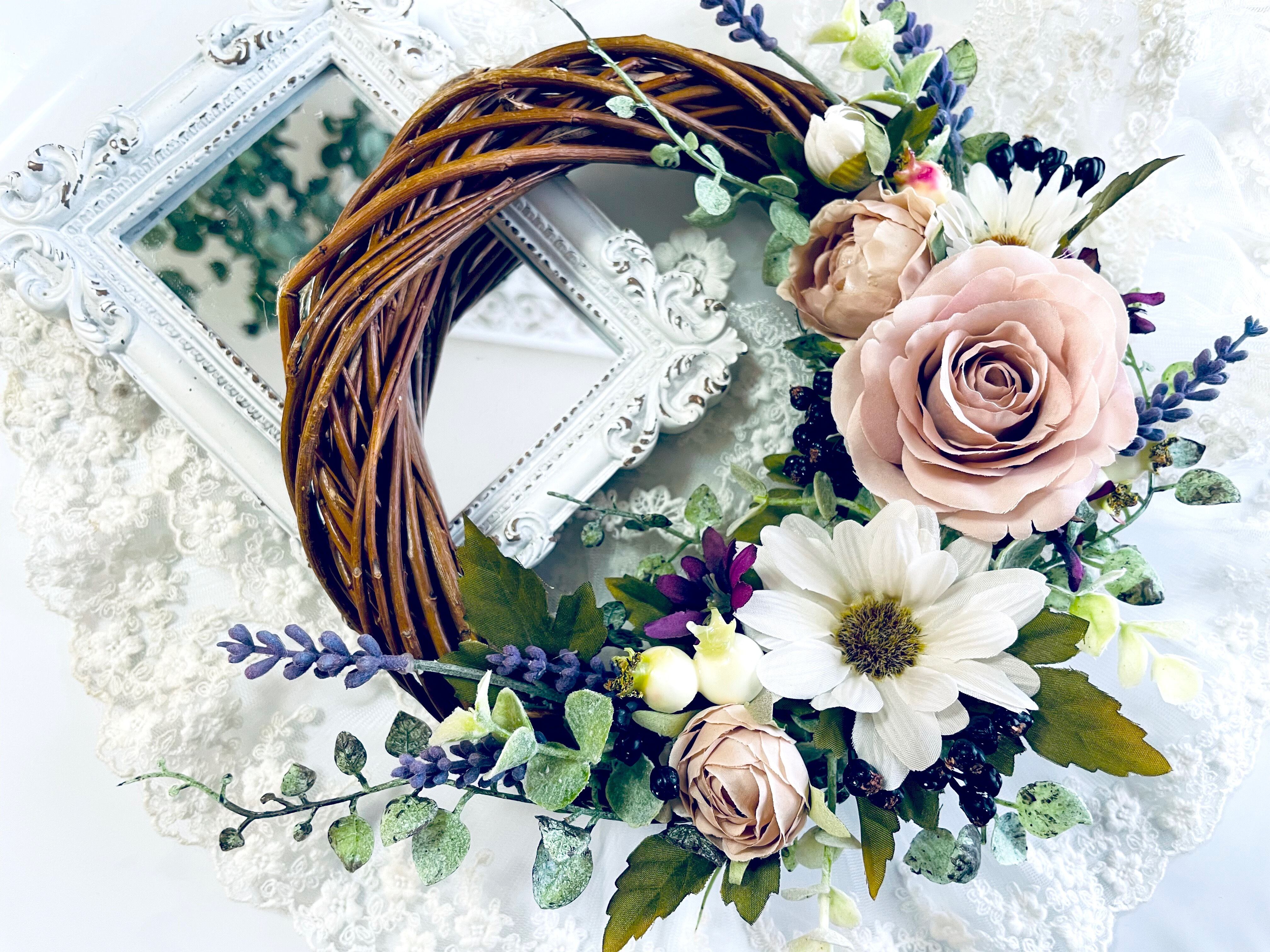 高級アーティフィシャルフラワーを使用し癒しの空間の彩りにリースをデザインしました。