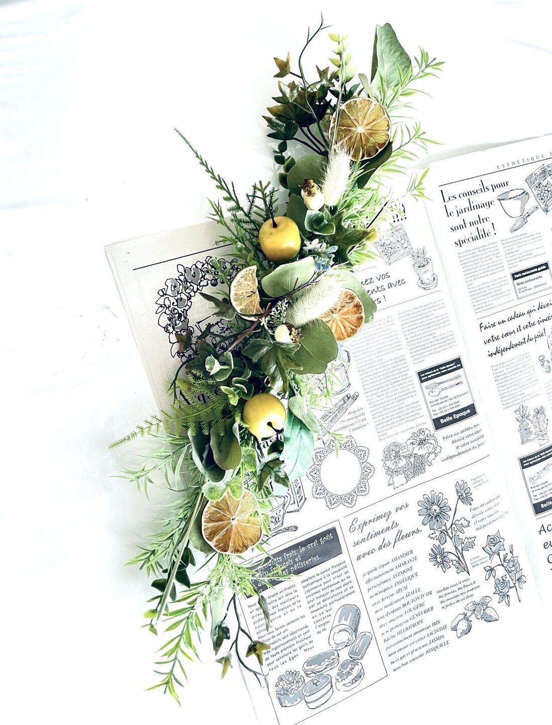 風が吹くような爽やかなアーティフィシャルフラワーのスワッグ、綺麗に作られた造花、ナチュラルなユーカリポポラスのドライ、ドライライムなど