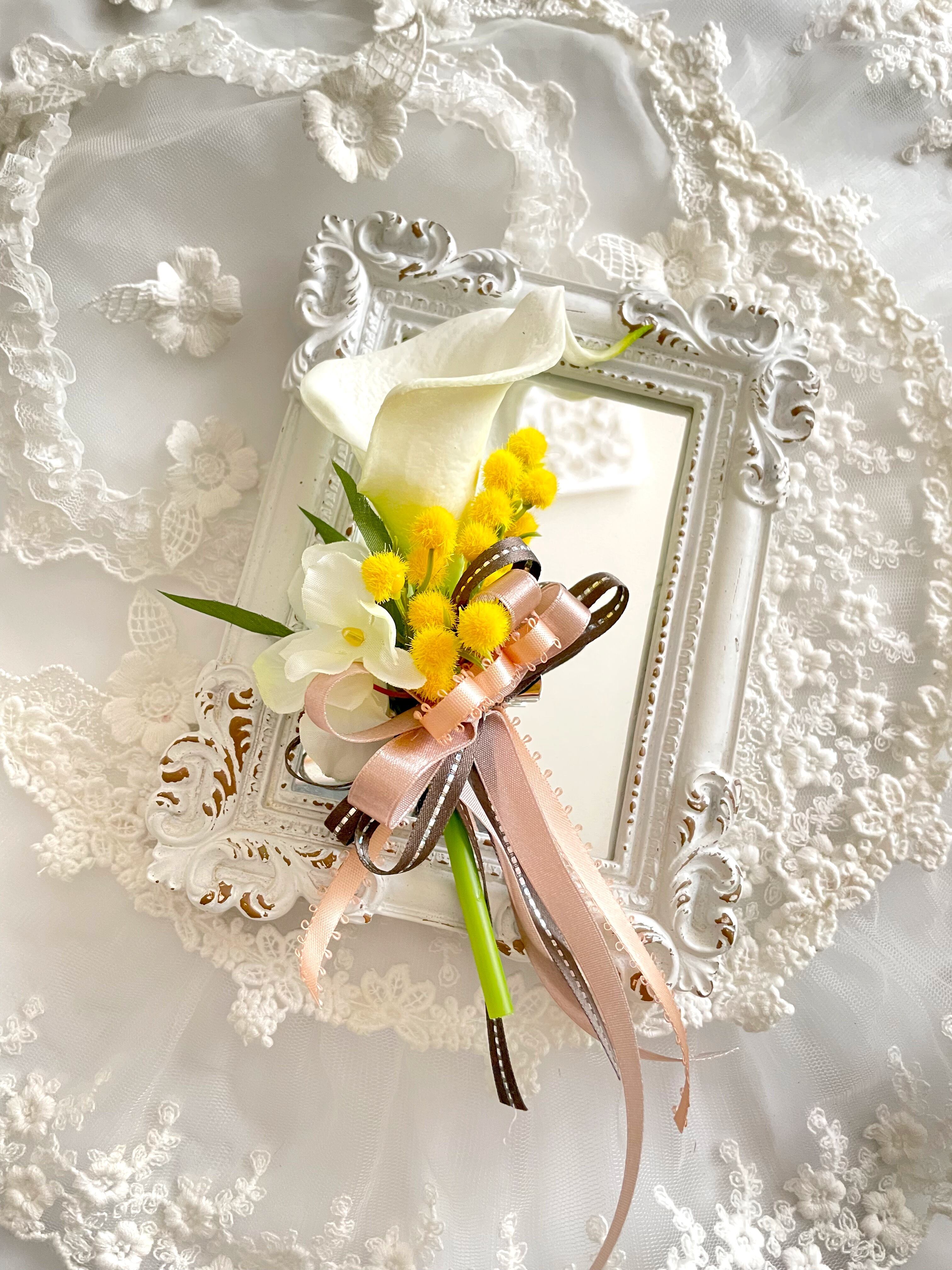 結婚式*卒業*入学式*新作コサージュ*カラーとミモザの優しいハルイロコサージュ*無料ラッピングあり