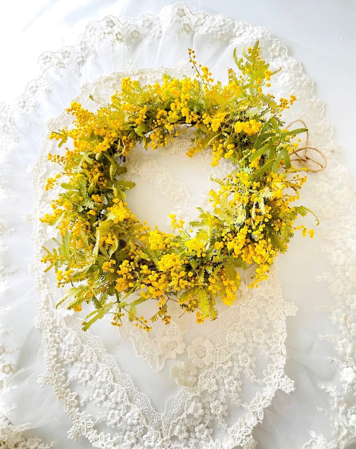 春を告げる優しい黄色のドライフラワーのミモザのリース