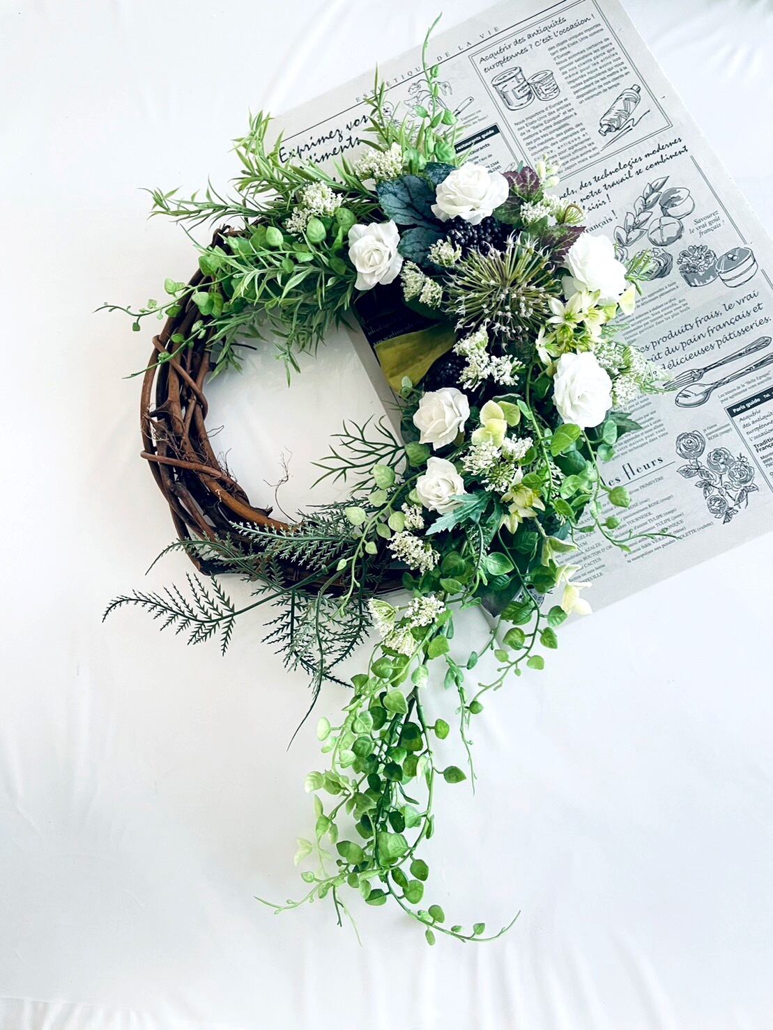 母の日*誕生日*結婚祝い*白薔薇と爽やかなグリーンのフラワーリース*無料ラッピングあり