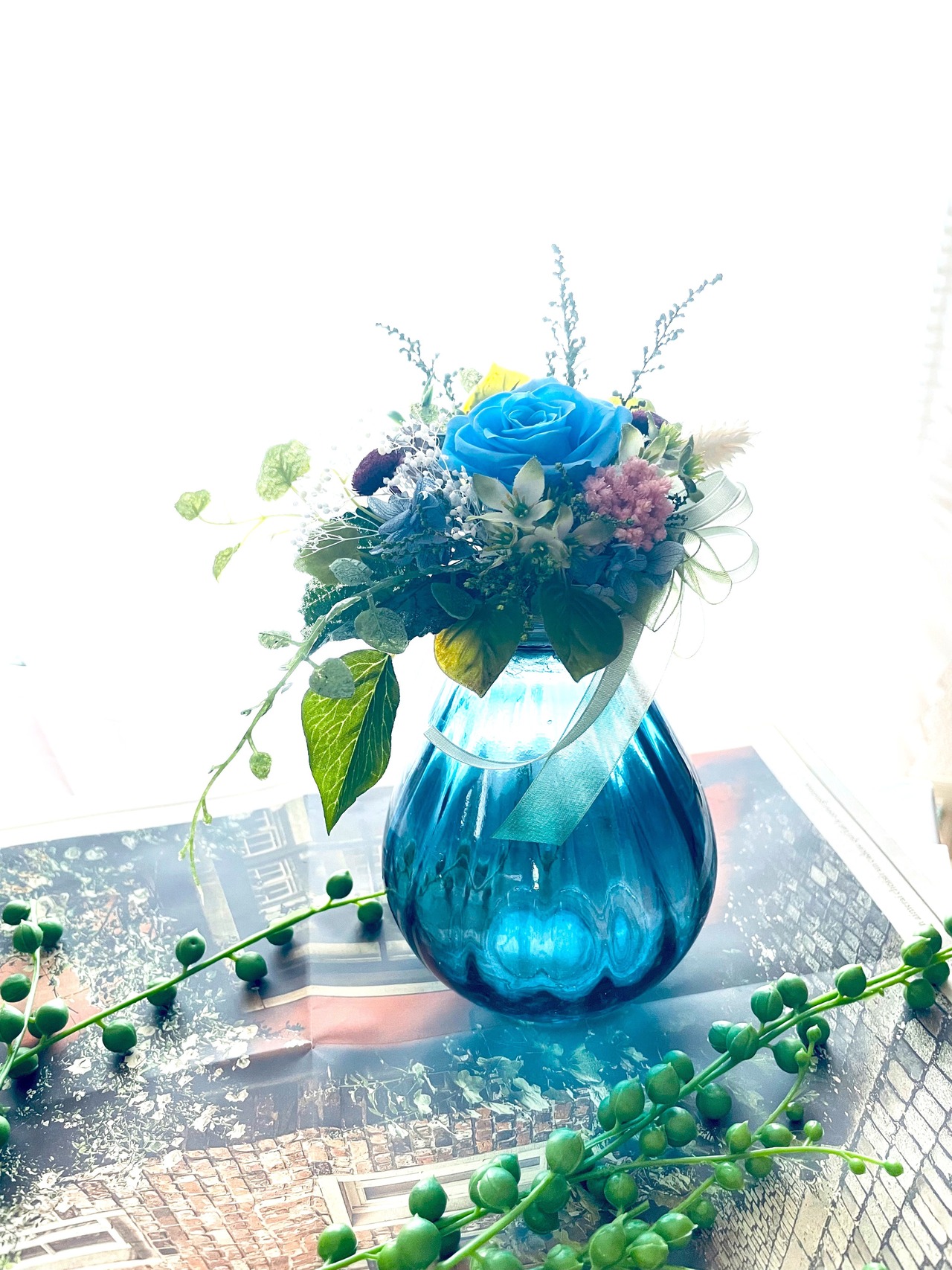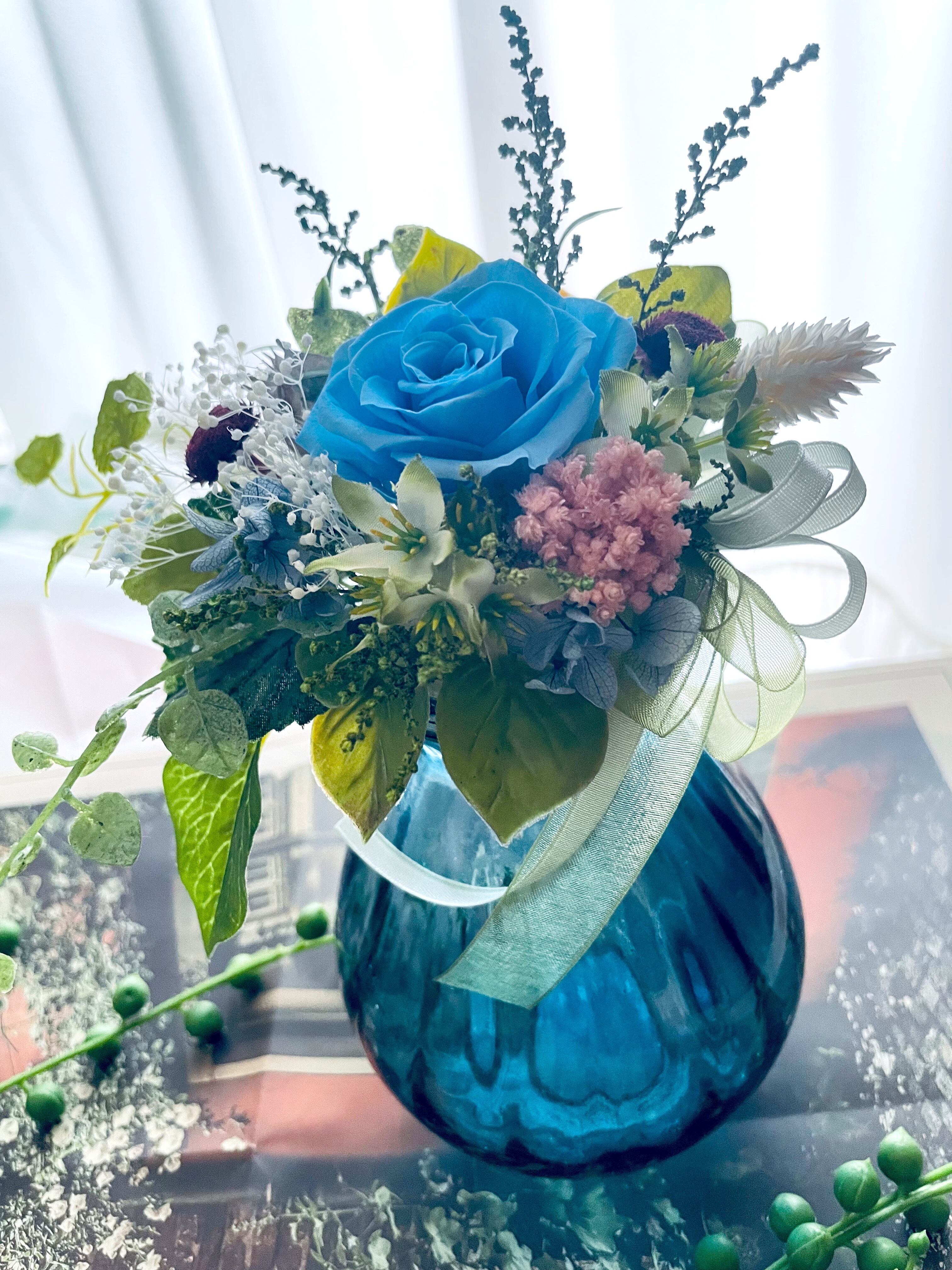 初夏の新作*記念日*誕生日*結婚祝い*初夏に似合うブルーの花器のプリザーブドフラワーアレンジメント*色変更可能