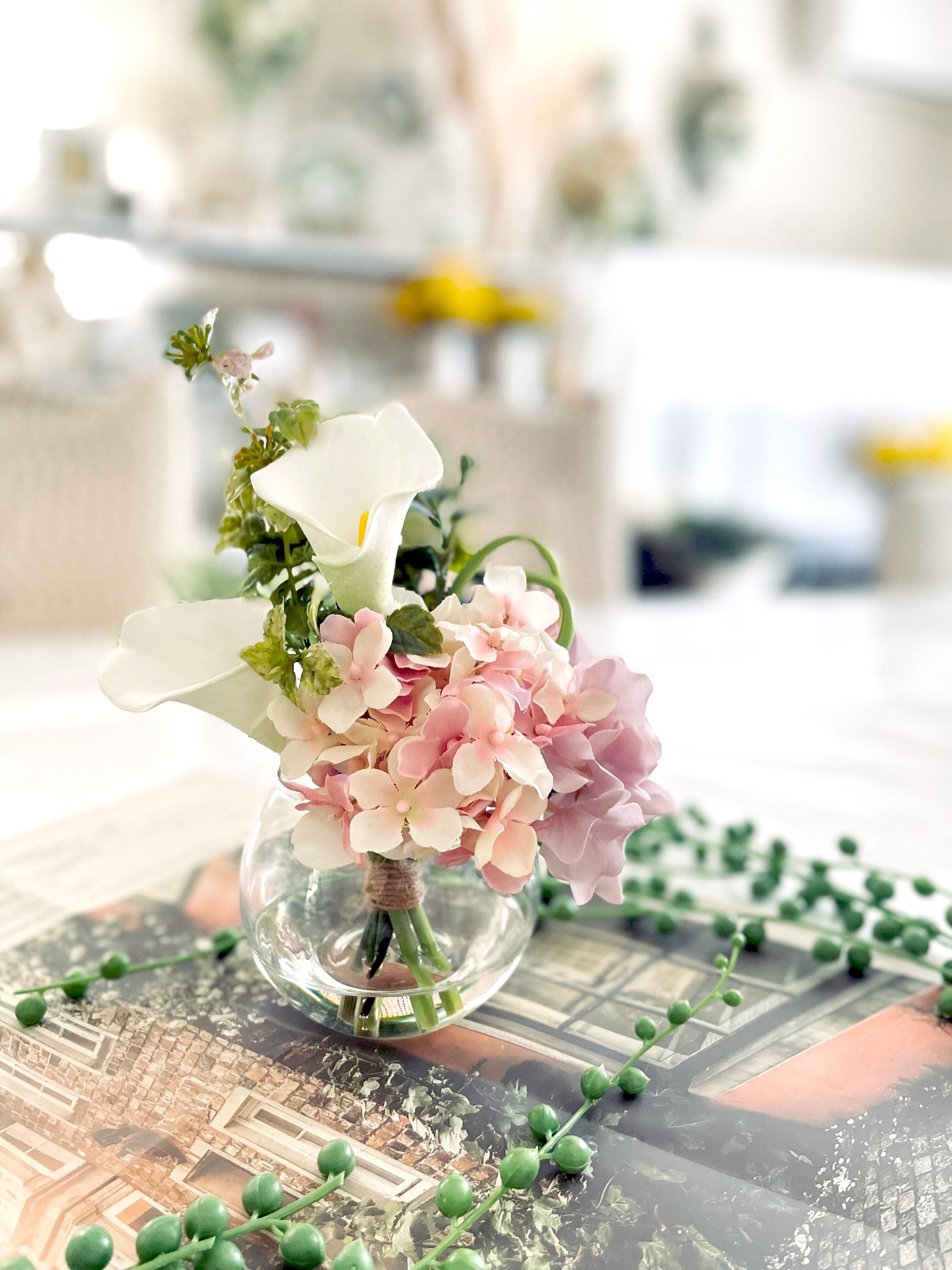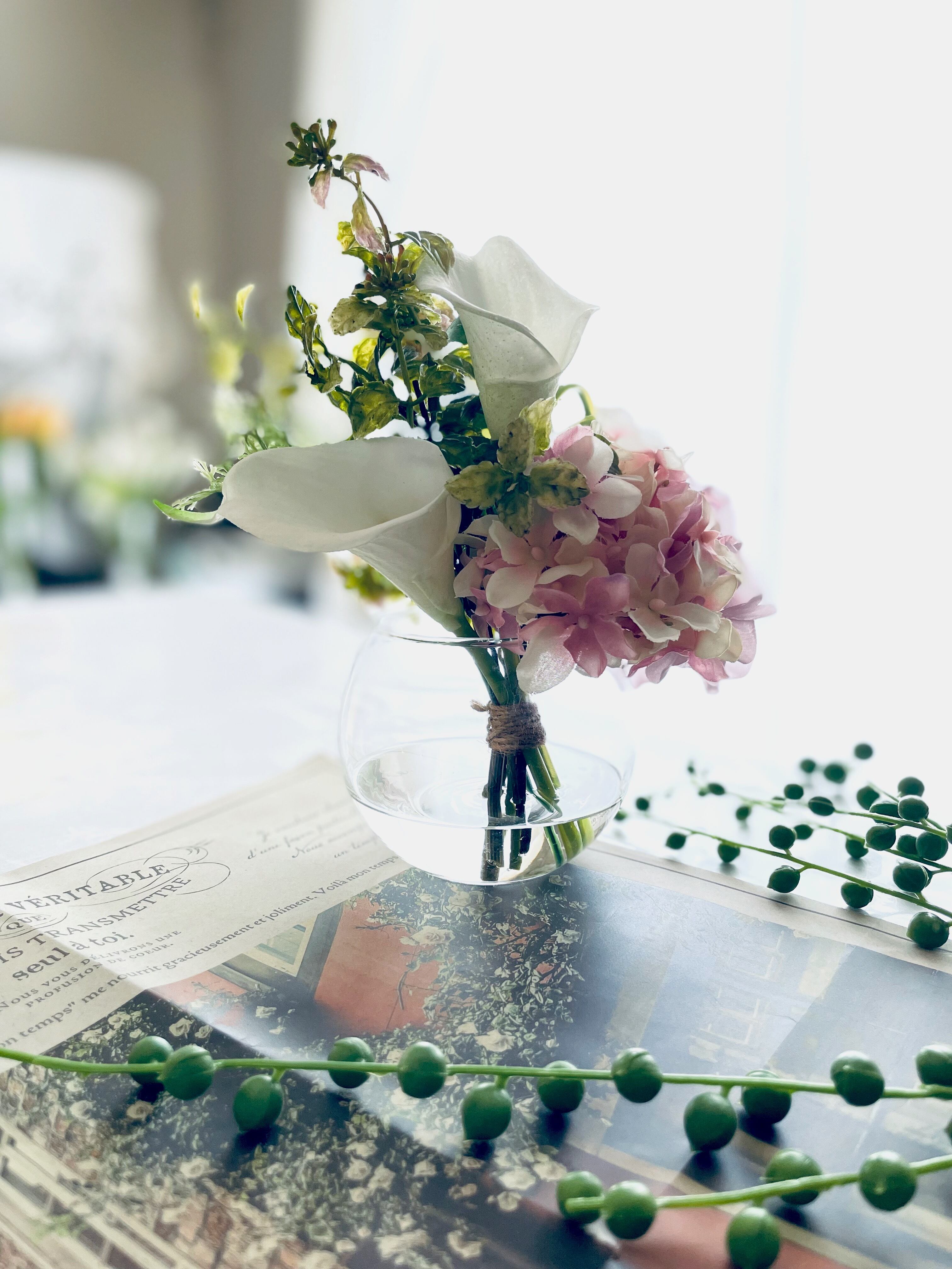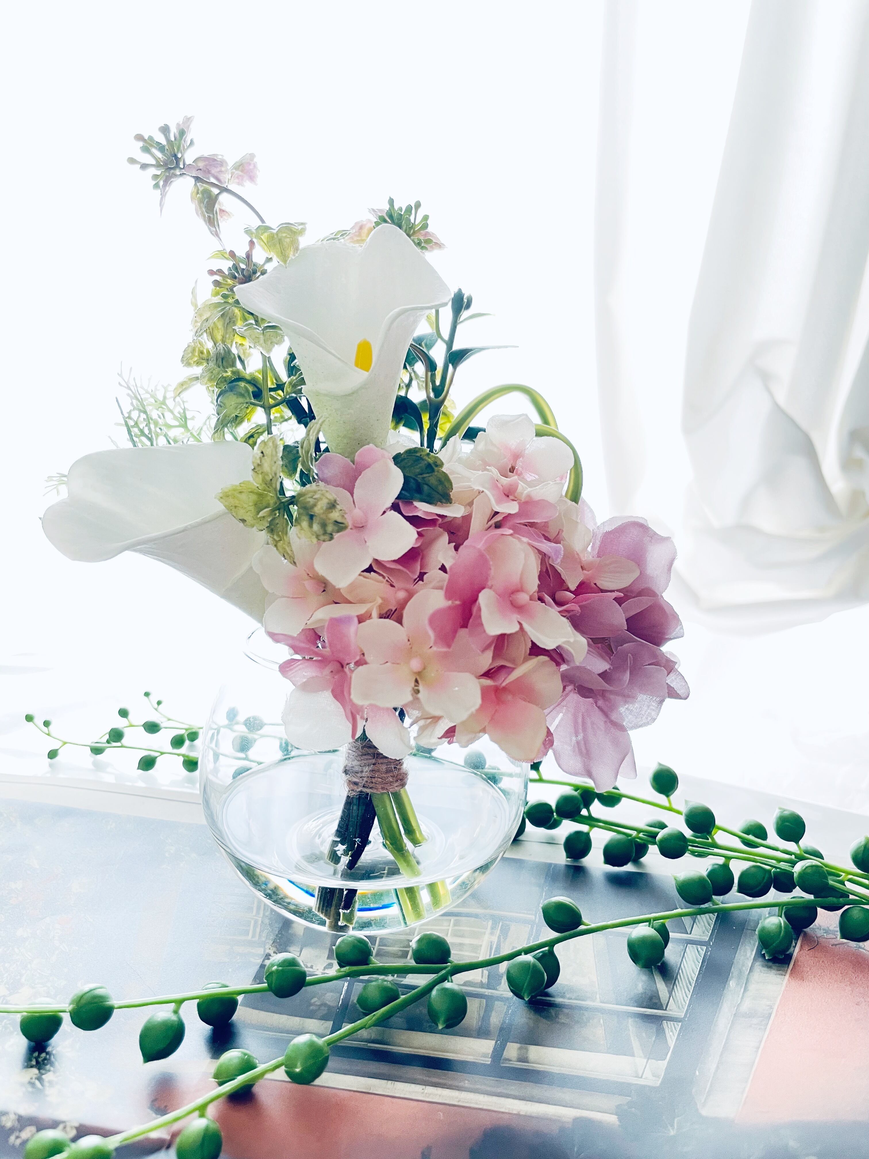 水換え不要のガラス花瓶を使用し爽やかなアレンジをデザインしました*:.。..。.:**:.。. .。.:*・゜゜・*
