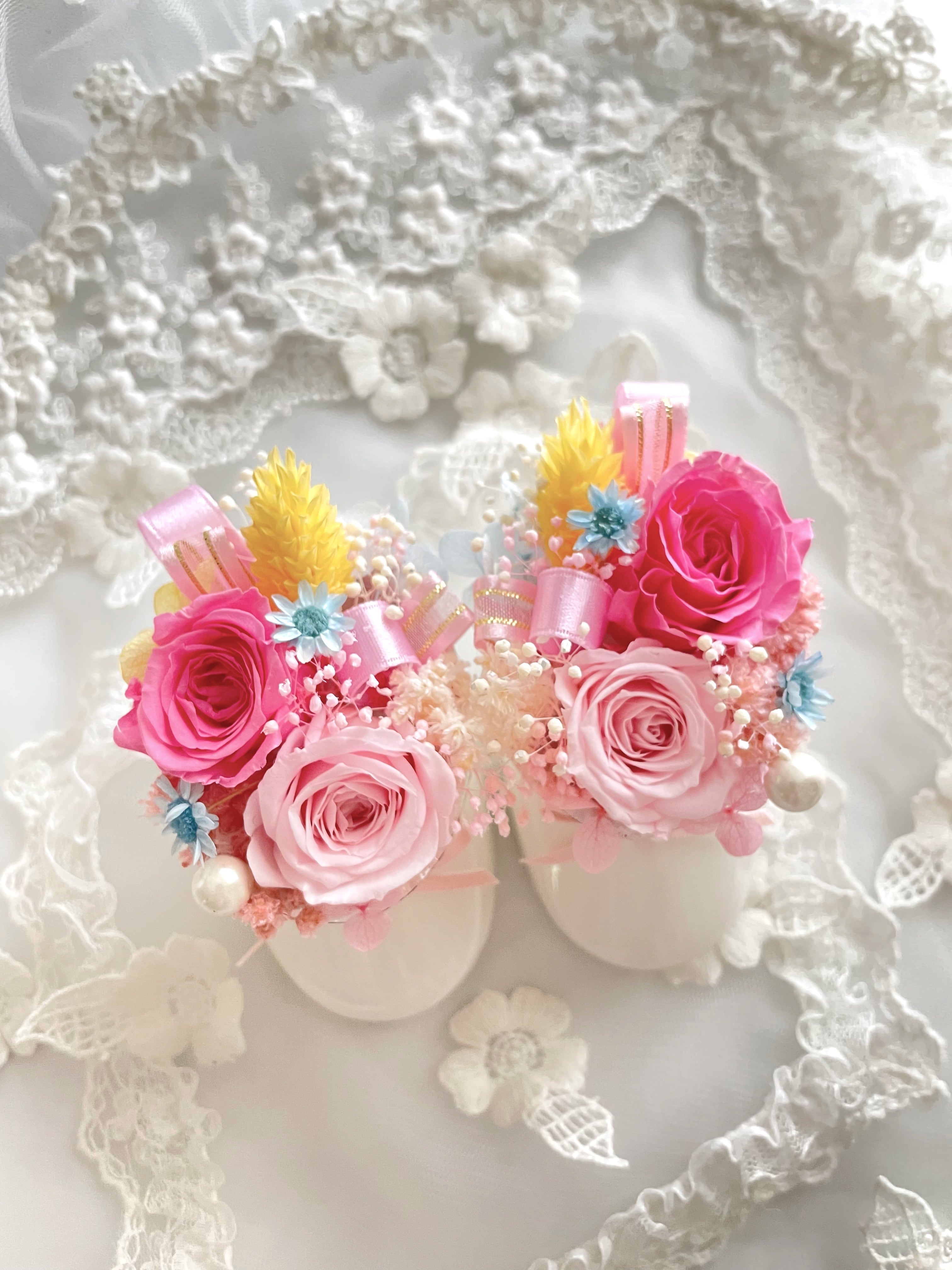 明るく繊細な色味のプリザーブドフラワー、紫陽花、プリザーブドローズでお花畑のような可愛らしいベビーシューズです。