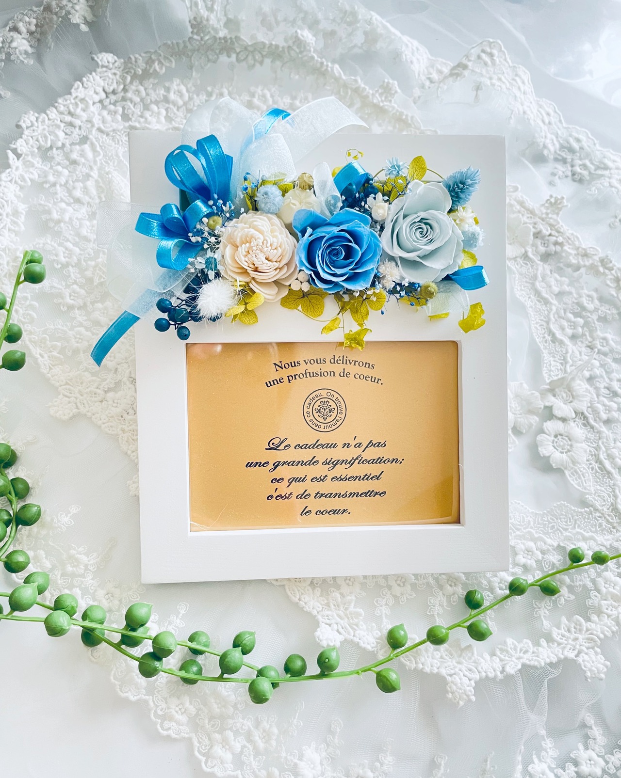 誕生日*結婚祝い*お供え*想い出に優しく咲く可愛いブルーのプリザーブドフラワーフォトフレーム*縦横飾れる2way