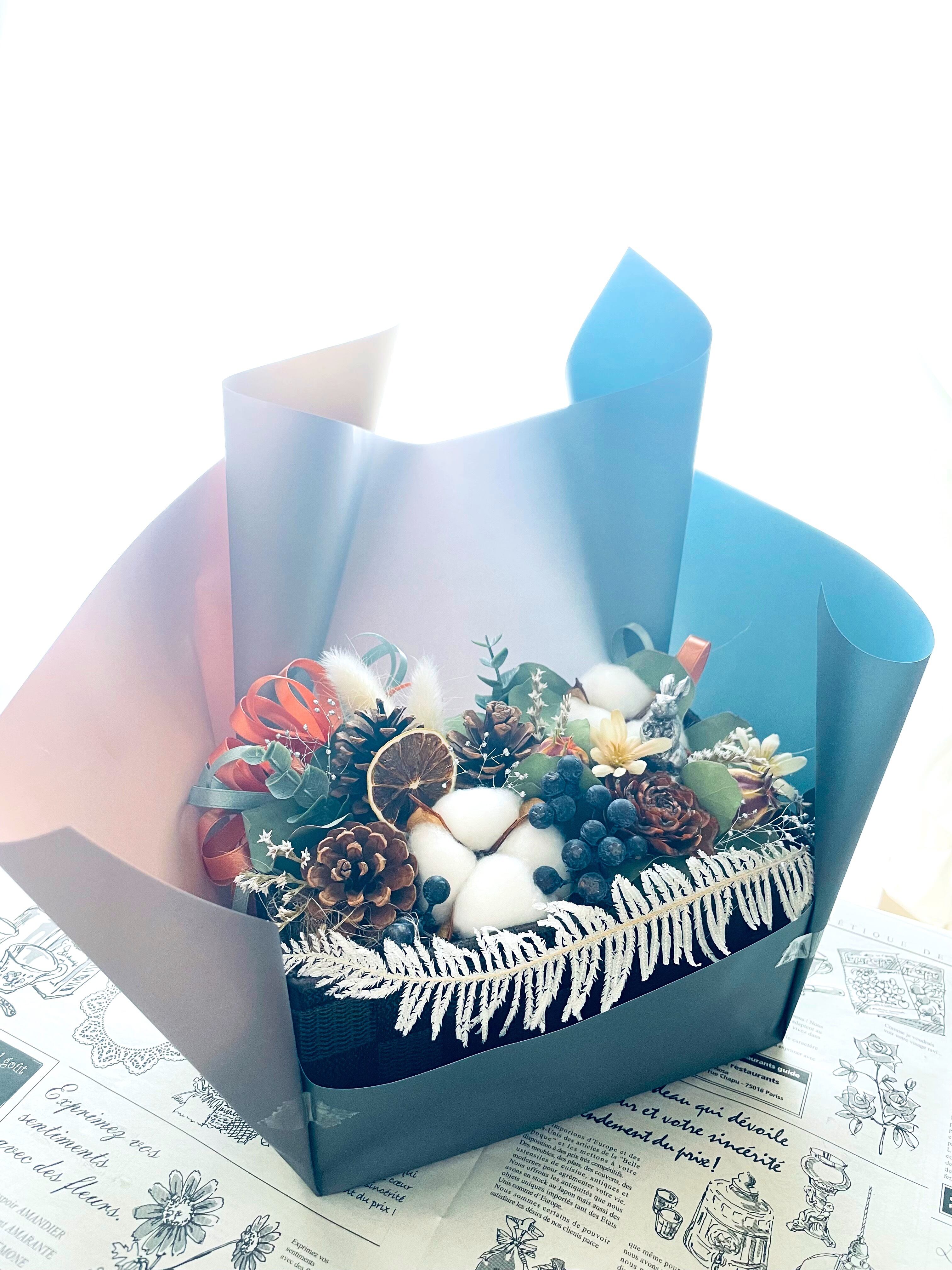 美しい暮れ合いのラッピングに包まれた秋冬を迎える森の散歩道フラワーアレンジ*誕生日*結婚祝い*無料ラッピングあり