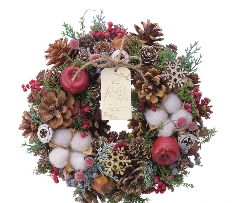 可愛いドライやフェイクの林檎、アーティフィシャルフラワーの可愛らしいリースで素敵なクリスマスをお過ごしください♪