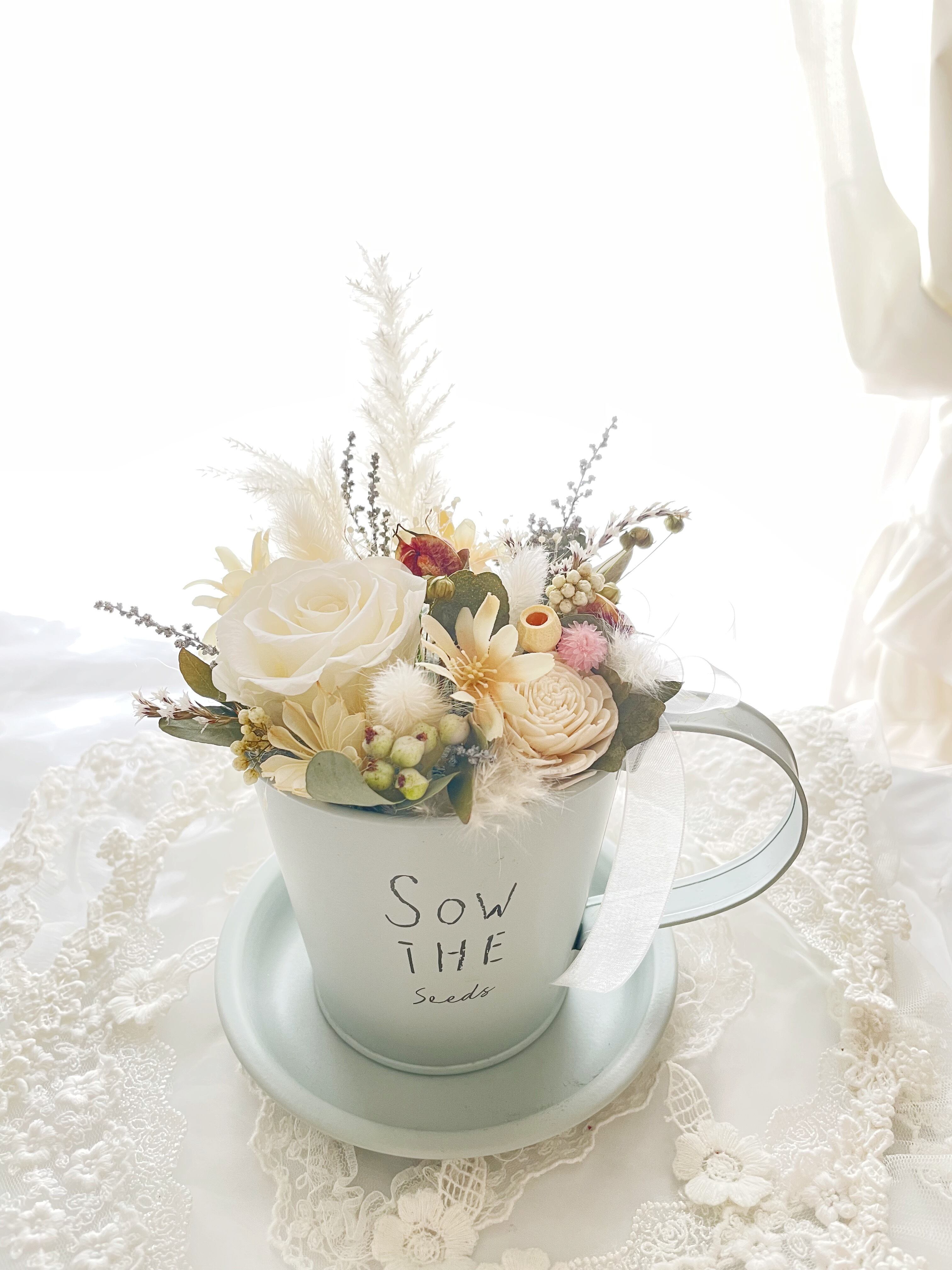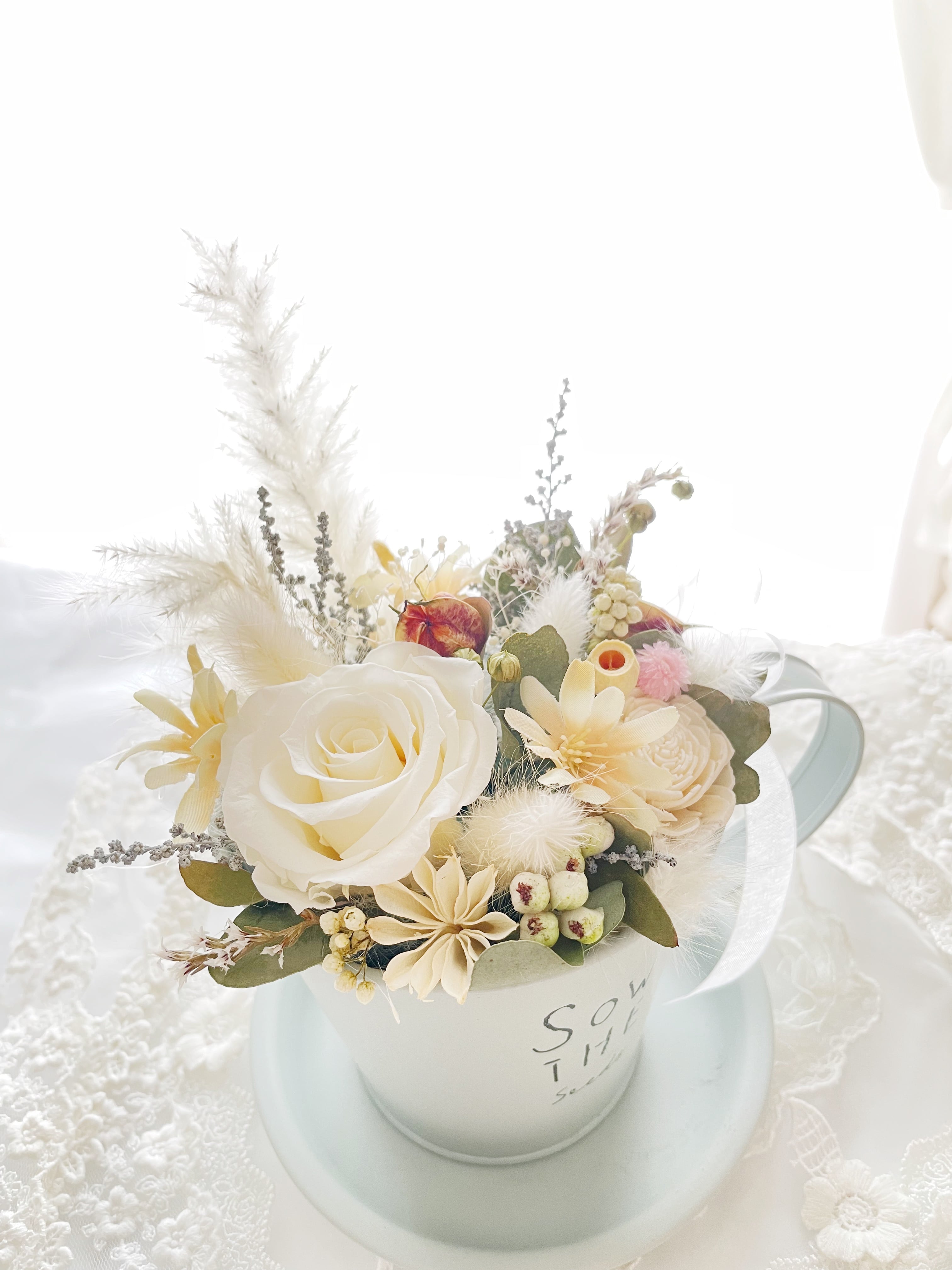 繊細な色味のプリザーブドフラワー、グリーン、造花、ドライフラワー、プリザーブドフラワーをナチュラルに新作の器にアレンジしました^^
