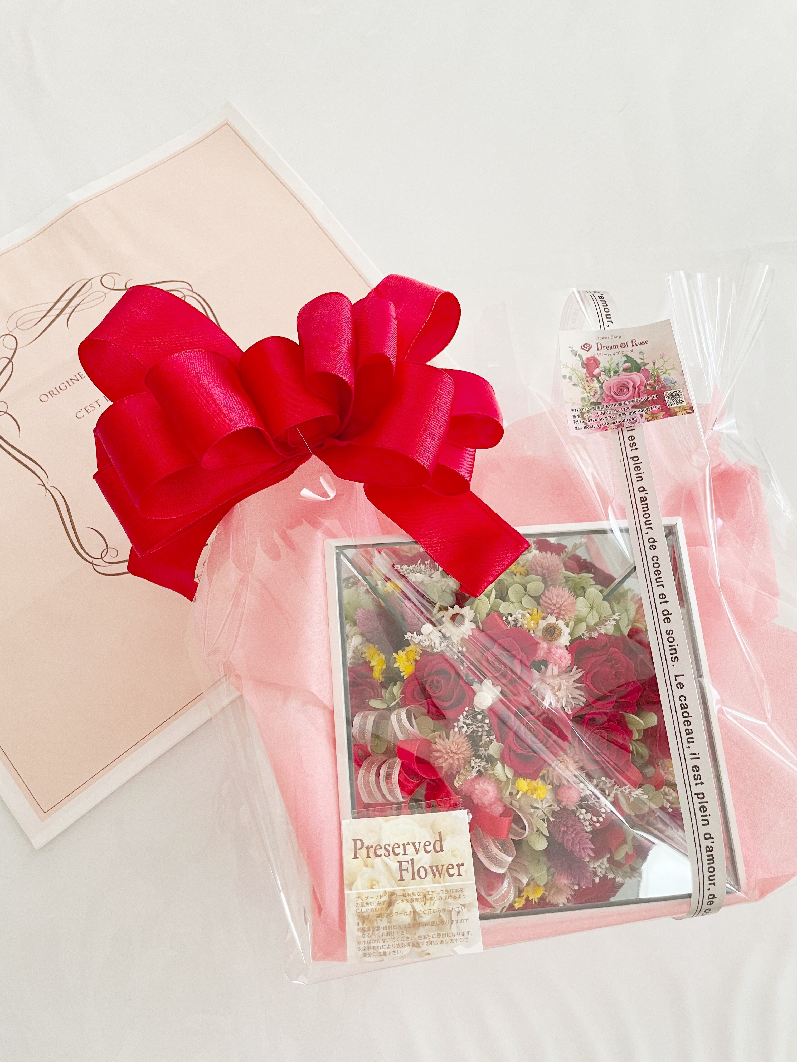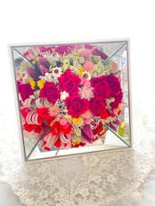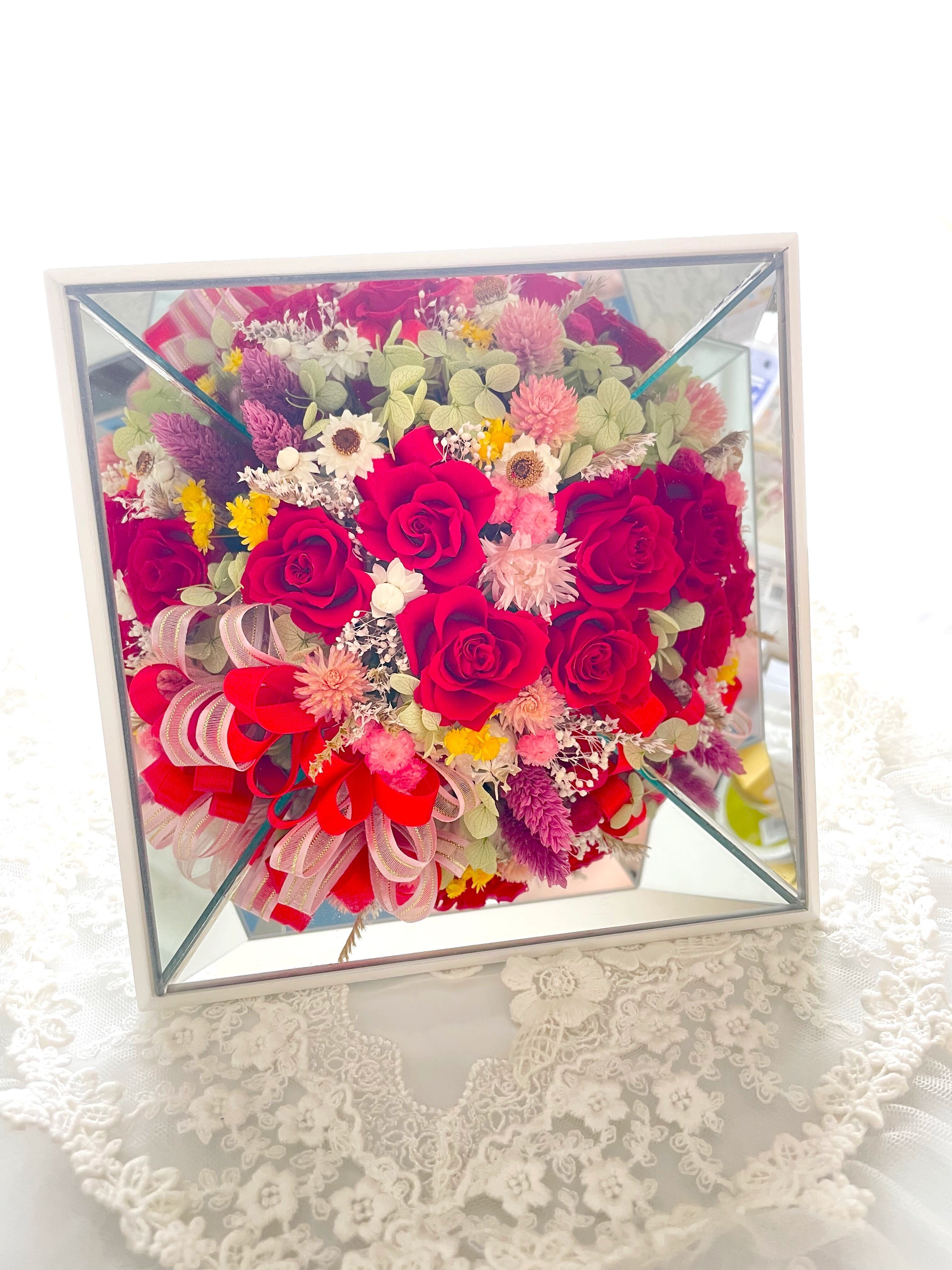 豪華な四面ミラーの綺麗なフレームにプリザーブドフラワーをアレンジしました。四方にお花が映り豪華なアレンジはギフトとしてとても華やかです。
