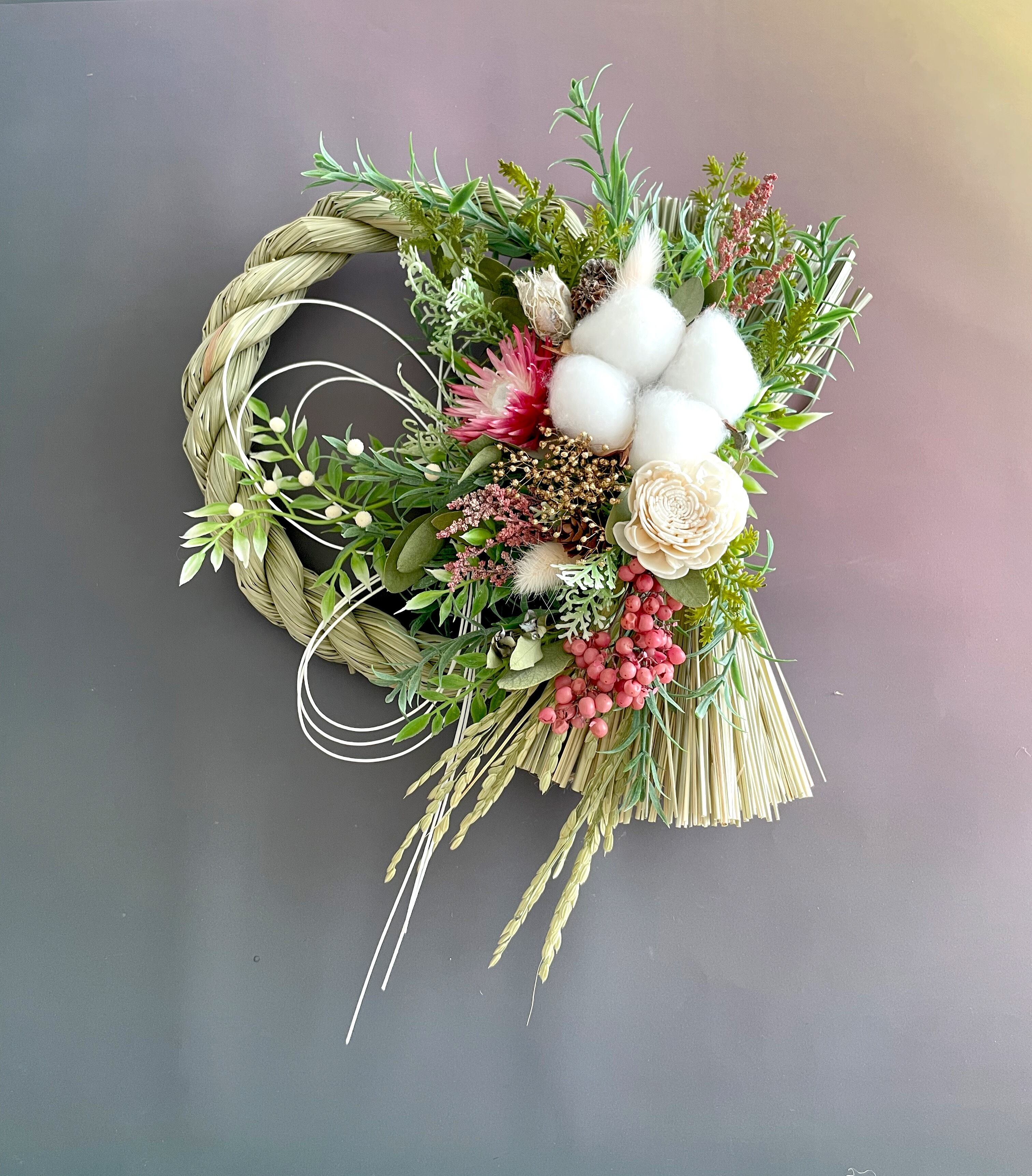 ナチュラルなドライフラワーや高級アーティフィシャルフラワーを使用したオリジナル専属デザイナーのしめ縄飾りで年神様という新年の神様をお迎えしましょう*・゜゚・*:.。..。.:*・ .。.:*・゜゚・*