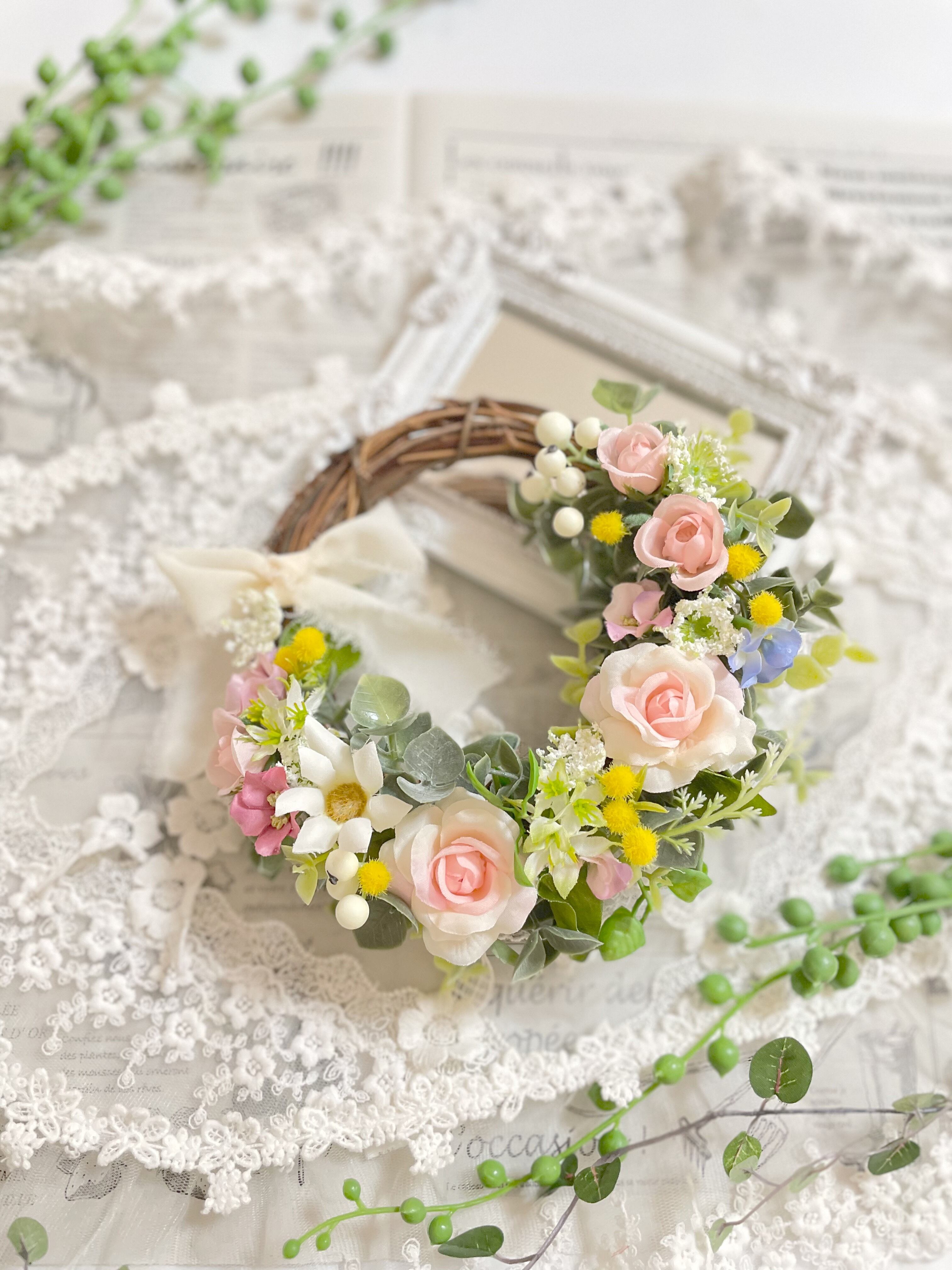 パステルピンクの薔薇と可愛い小花のフラワーリース*直径15センチ*造花*無料ラッピングあり