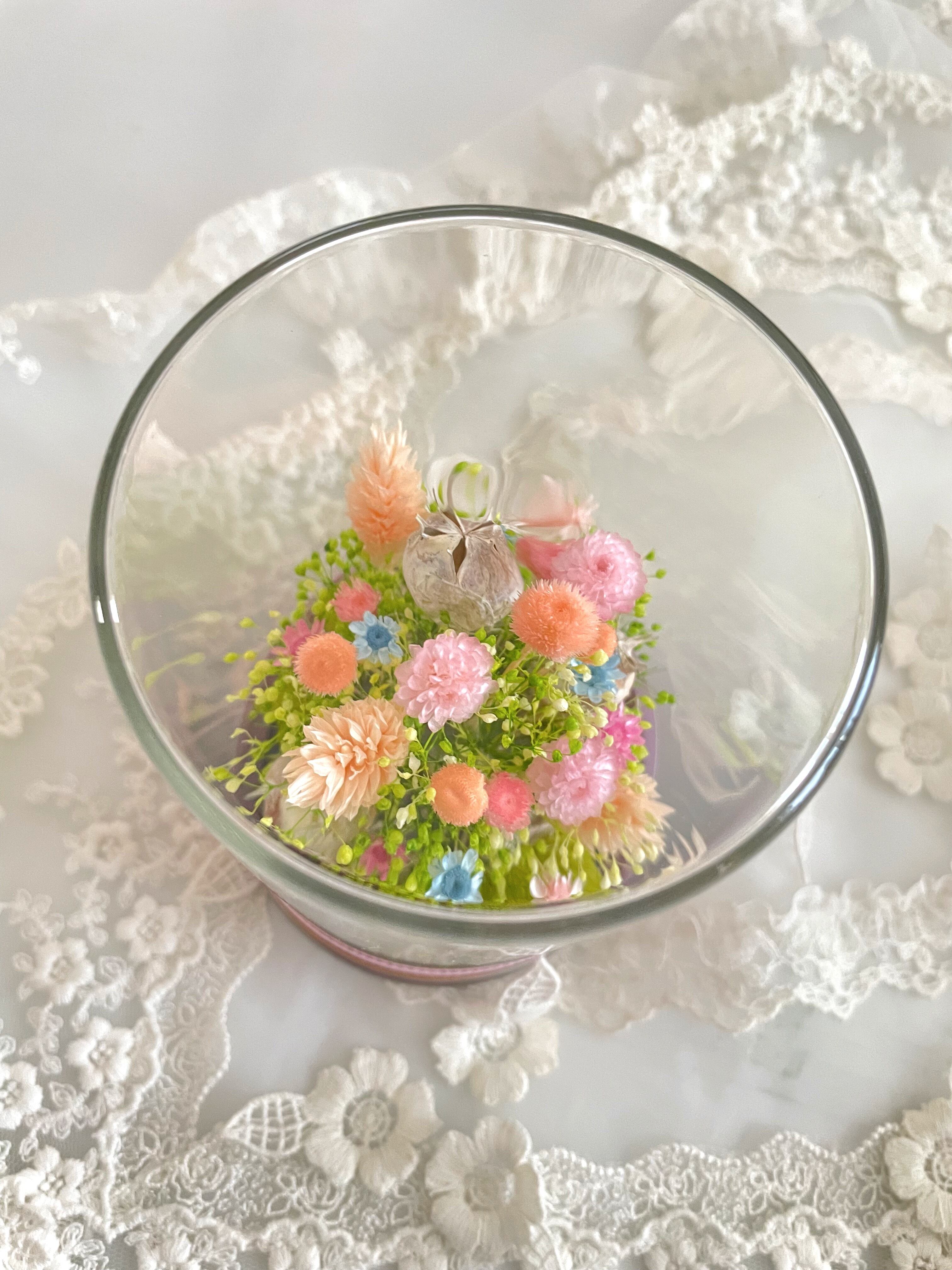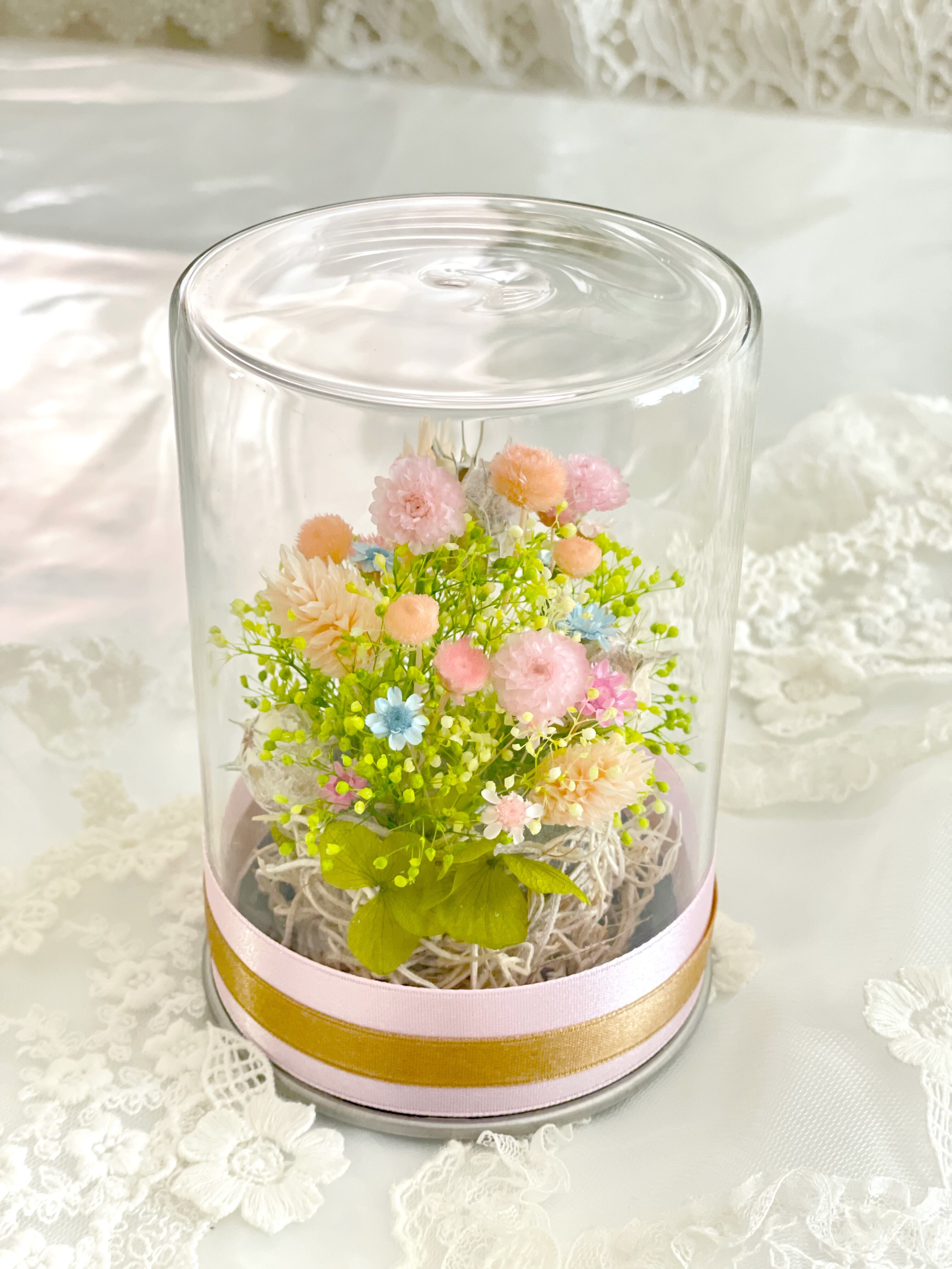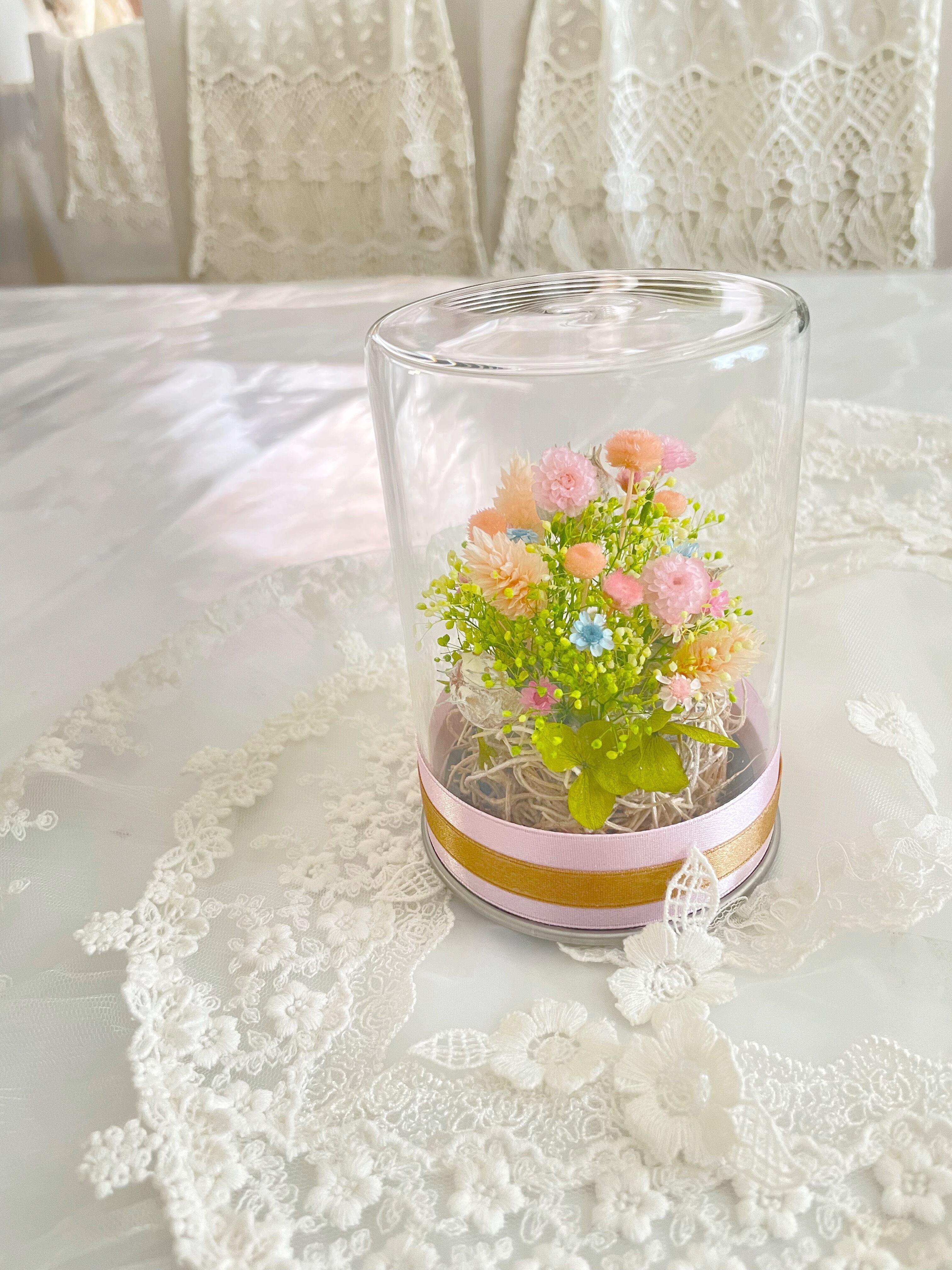 ガラスドームにプリザーブドフラワーと繊細なお花を詰めて花摘みフラワーアレンジメント