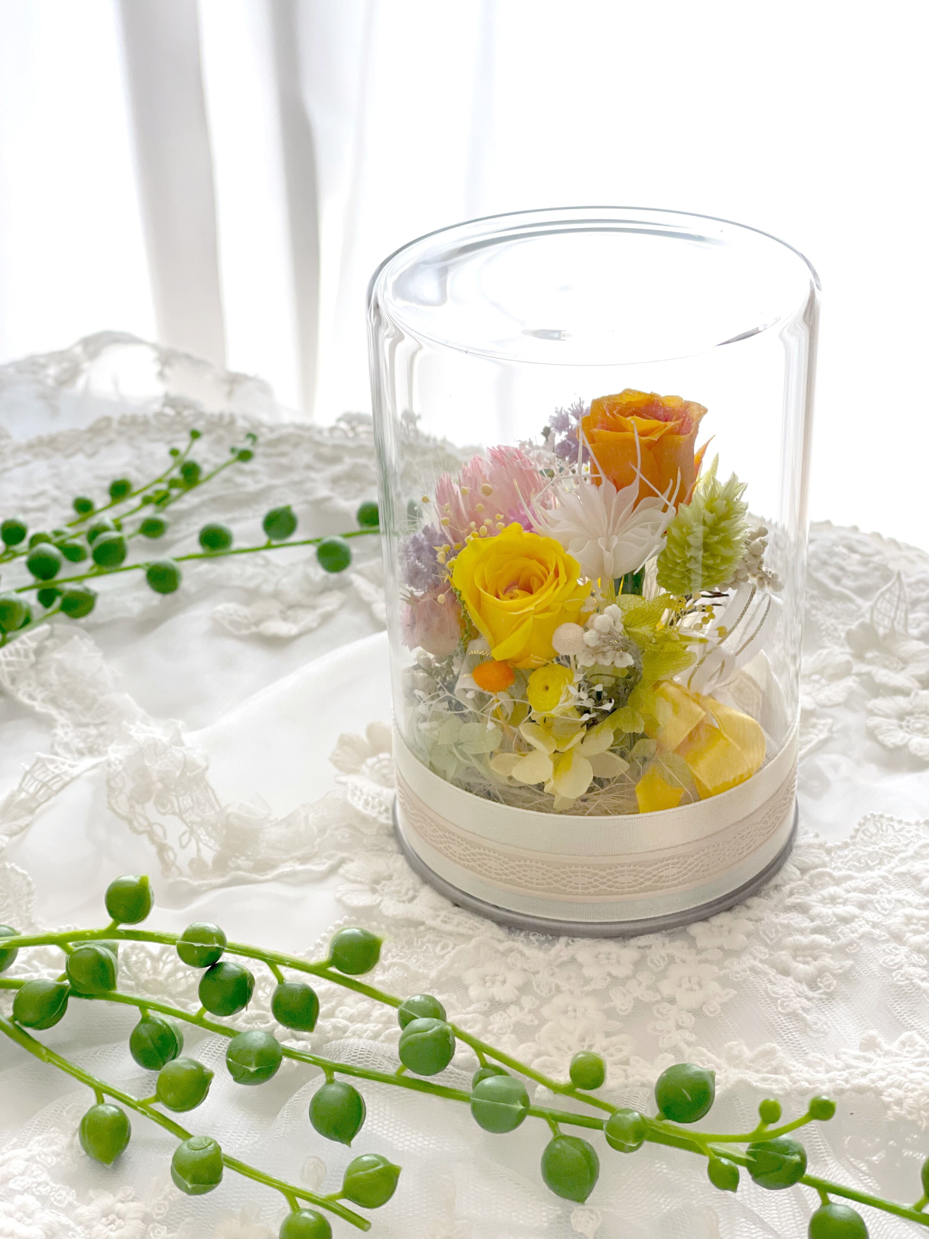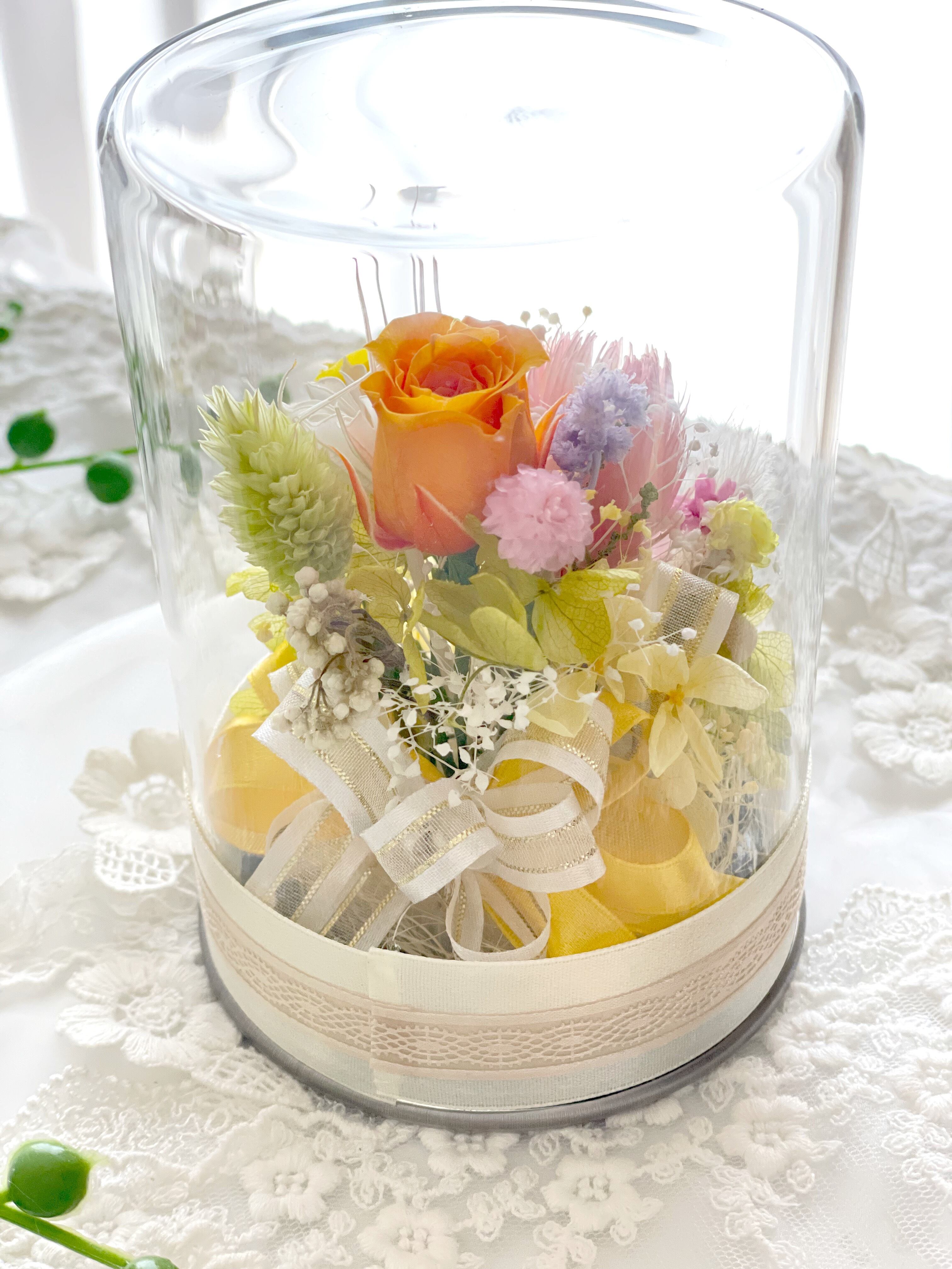 リアルな花々を美しいガラスドームに閉じ込め、特殊な加工で長期間色鮮やかな美しさを保っています。