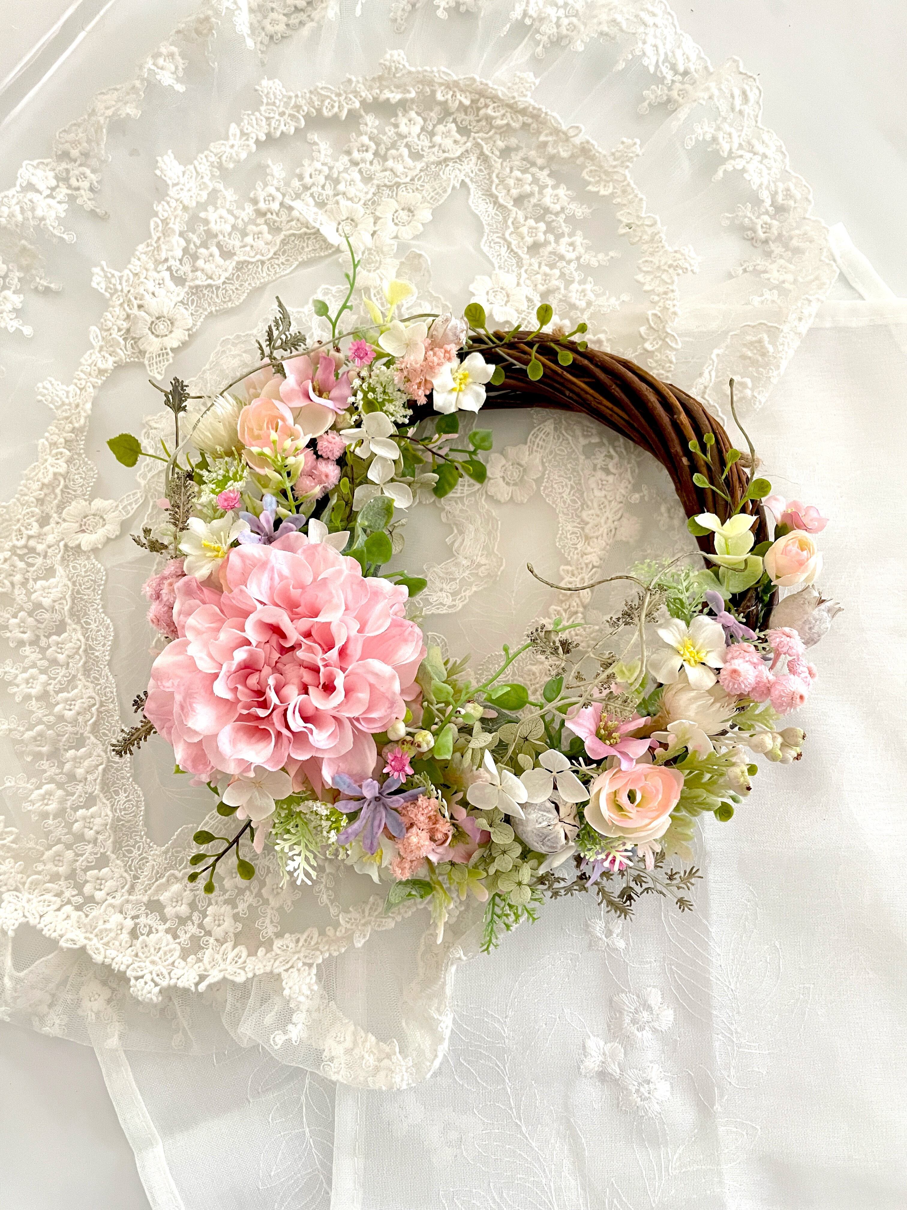 誕生日*結婚祝い*お供えにも*プリンセスピンクのダリアと小花達のフラワーリース*直径21センチ*無料ラッピングあり