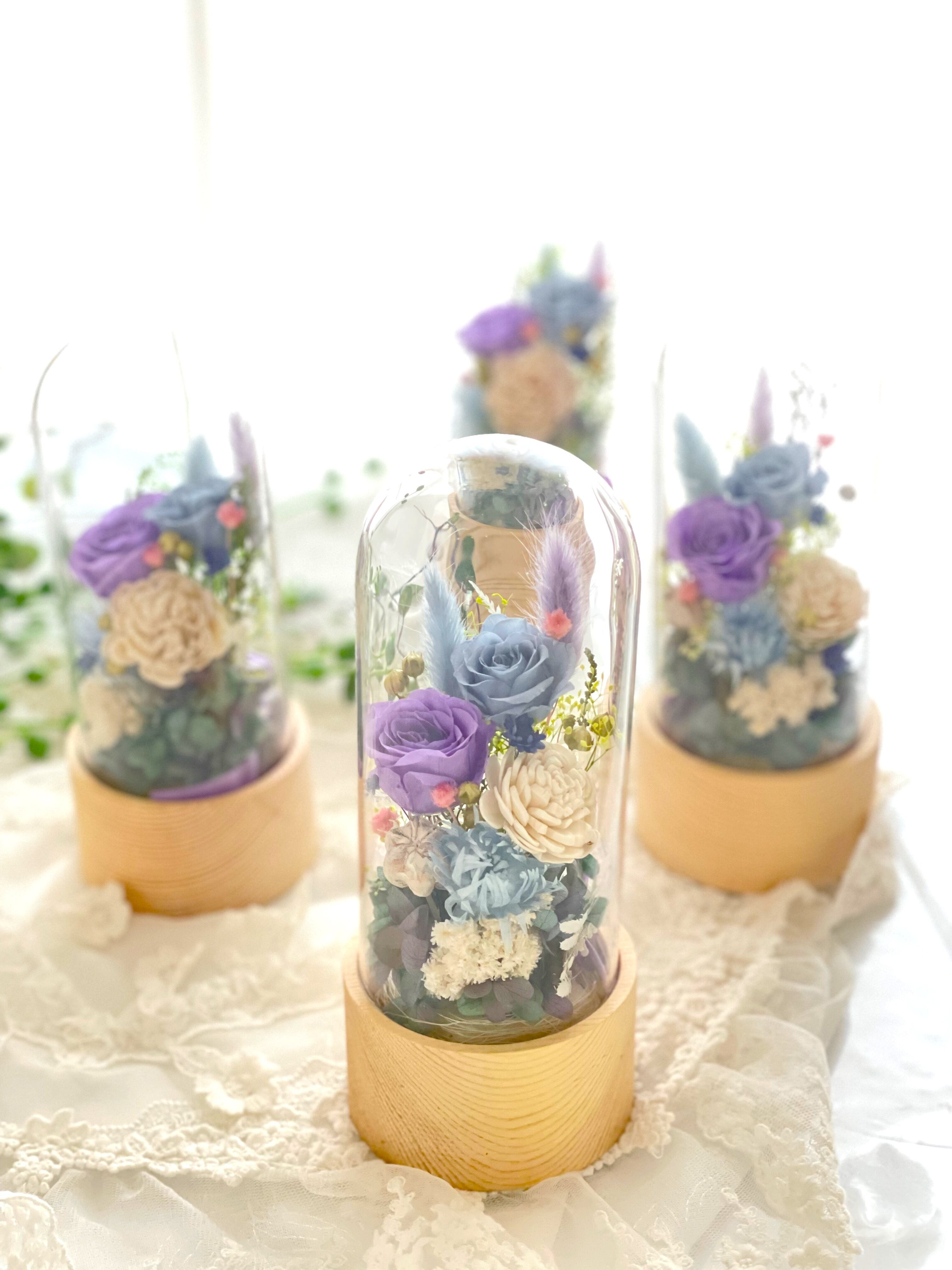 リアルな花々を美しいガラスドームに閉じ込め、特殊な加工で長期間色鮮やかな美しさを保っています。