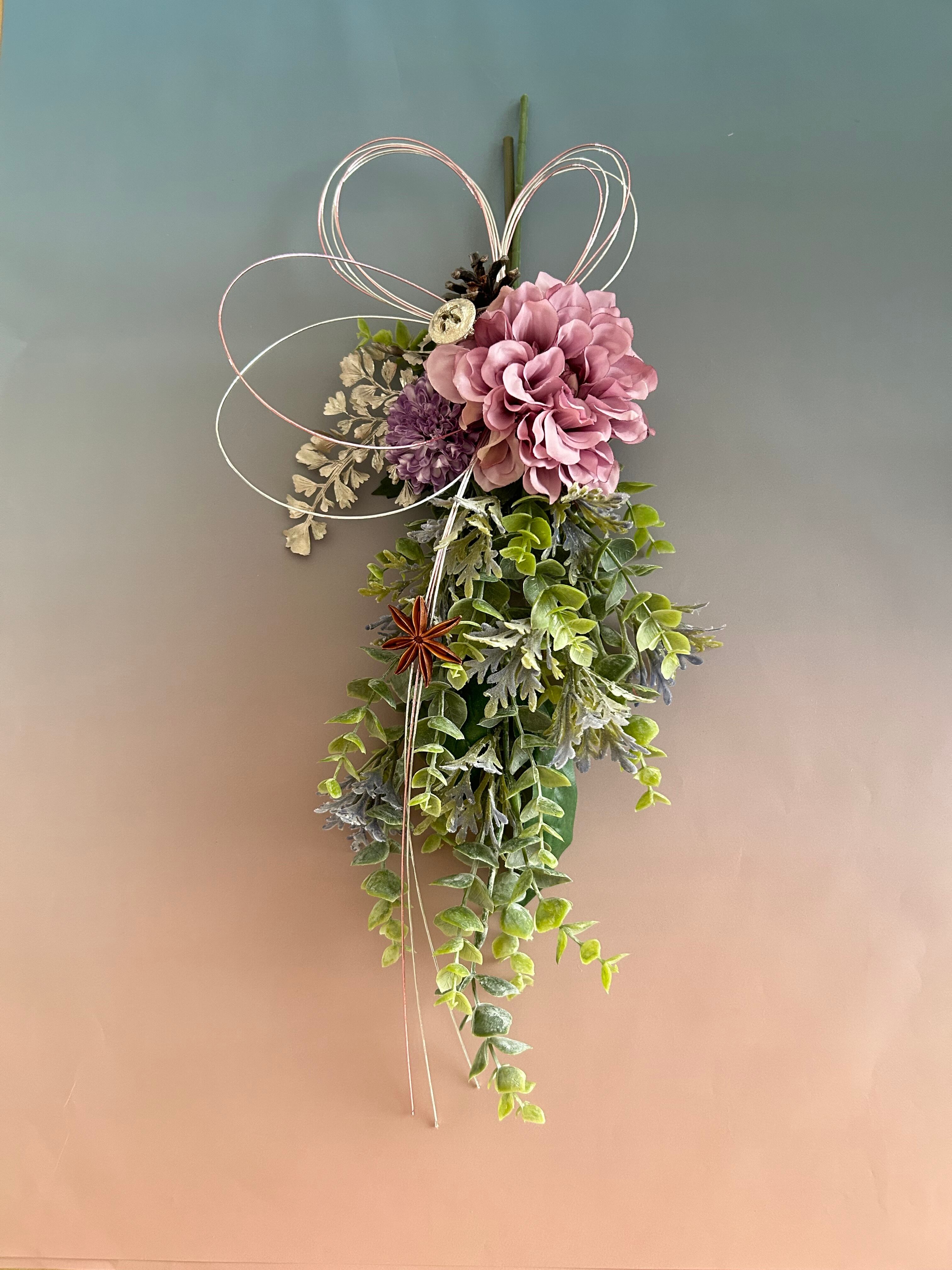 お正月早割り*新作*紫ダリアとマムで祝う自然に馴染む和風スワッグ