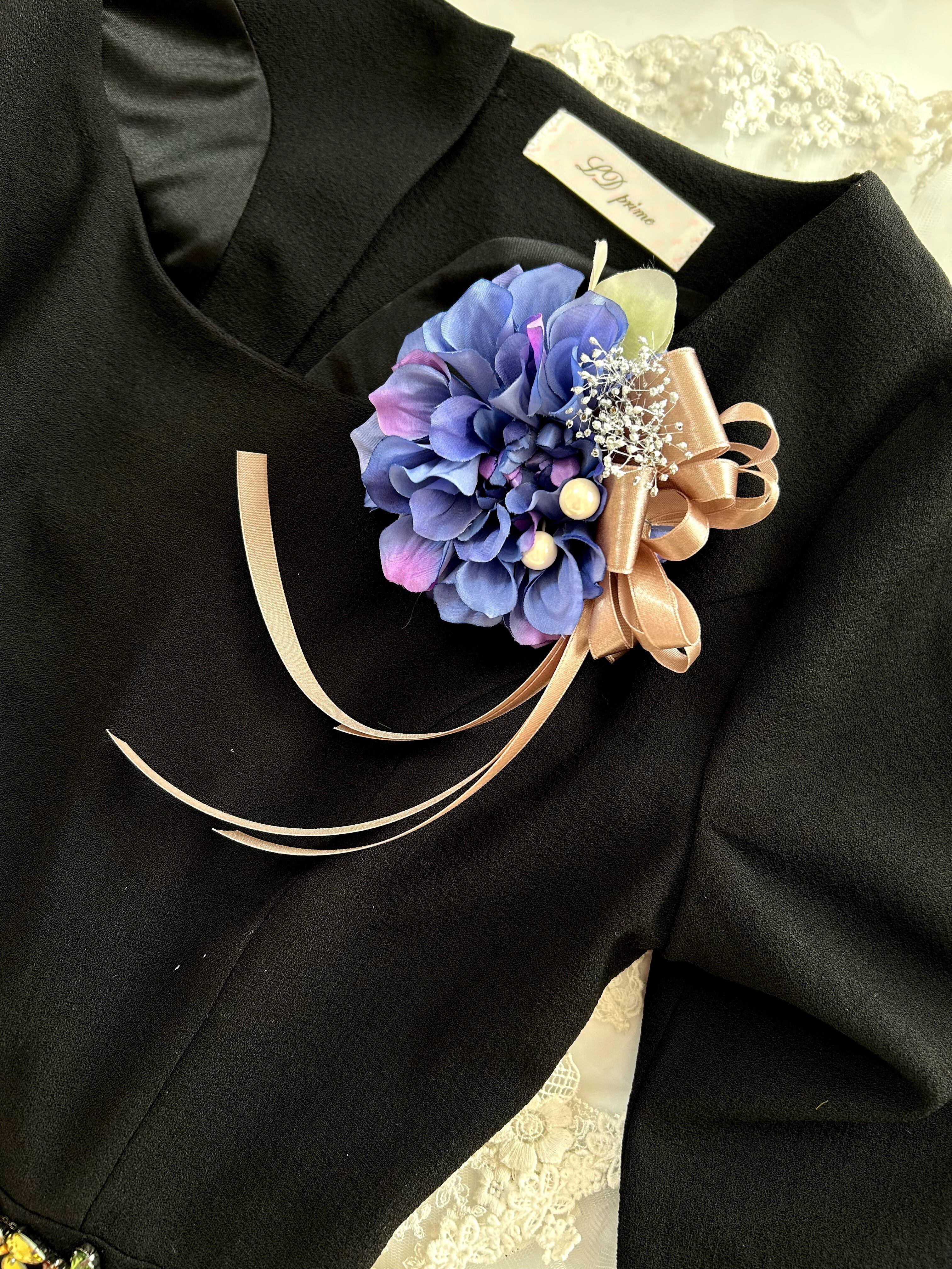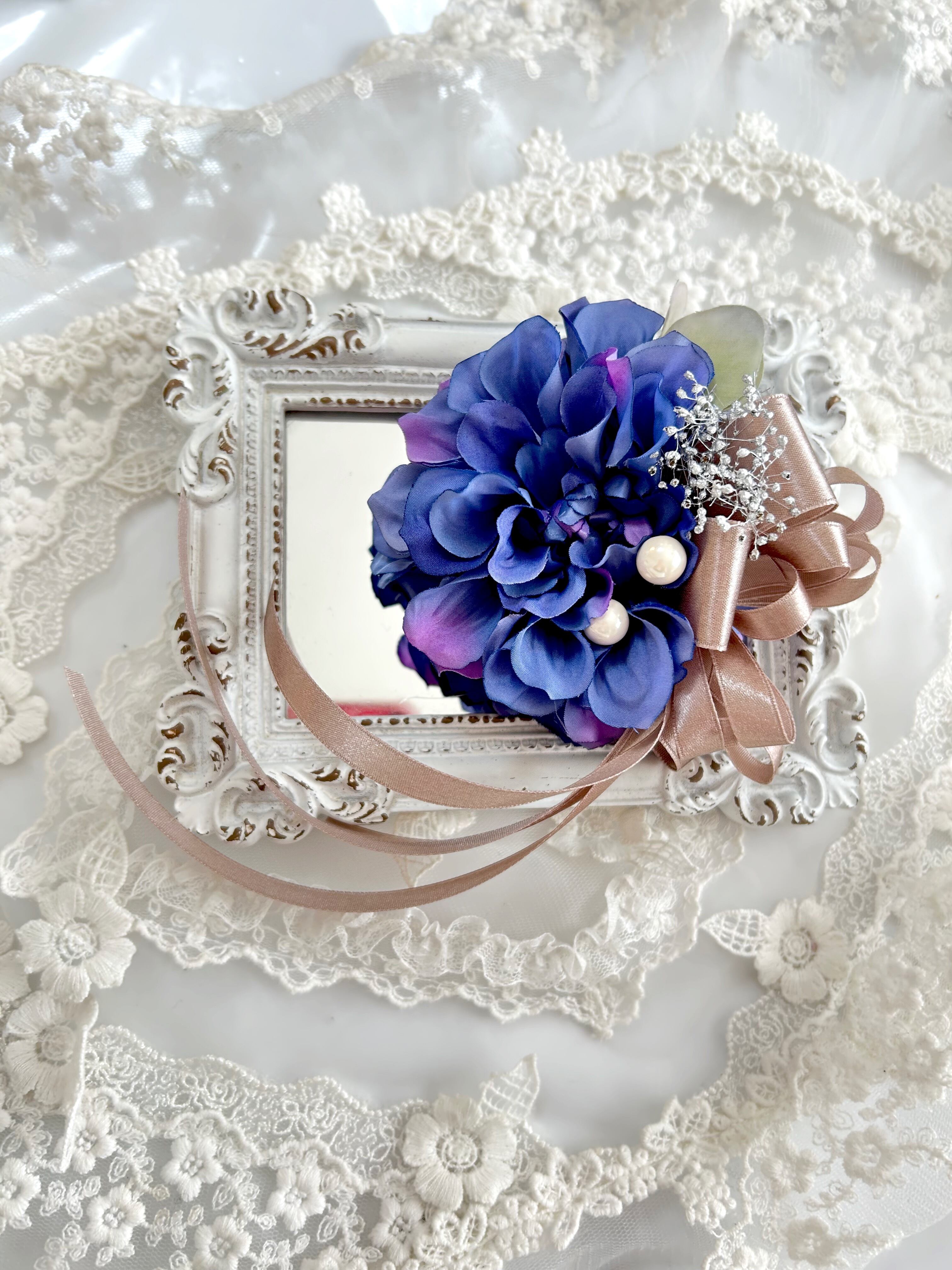 結婚式*卒業*入学式*コサージュ*髪飾り*美しいブルーダリアにニュアンスカラーのリボンとパールを添えて。